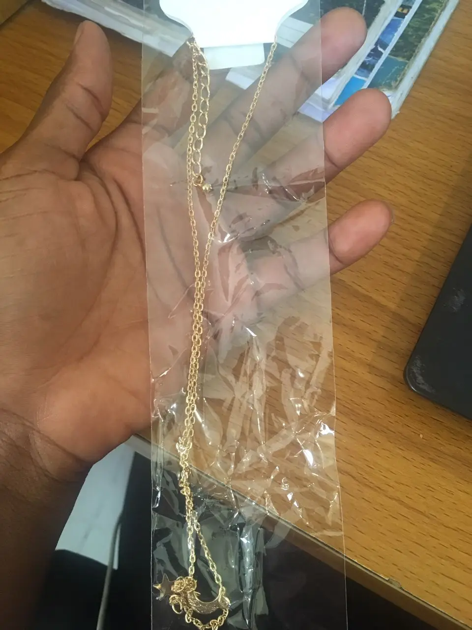 je n'ai pas reçu le collier comme sur la photo je suis deçue voila je l'ai pris en photo il est différent