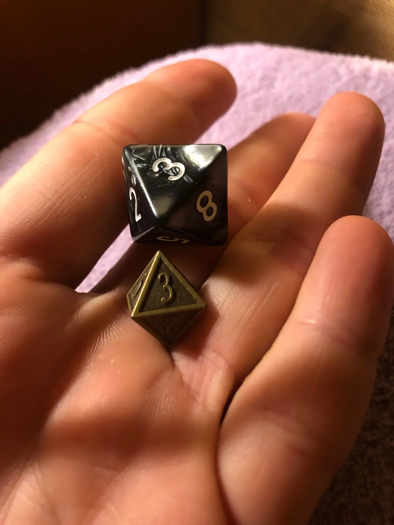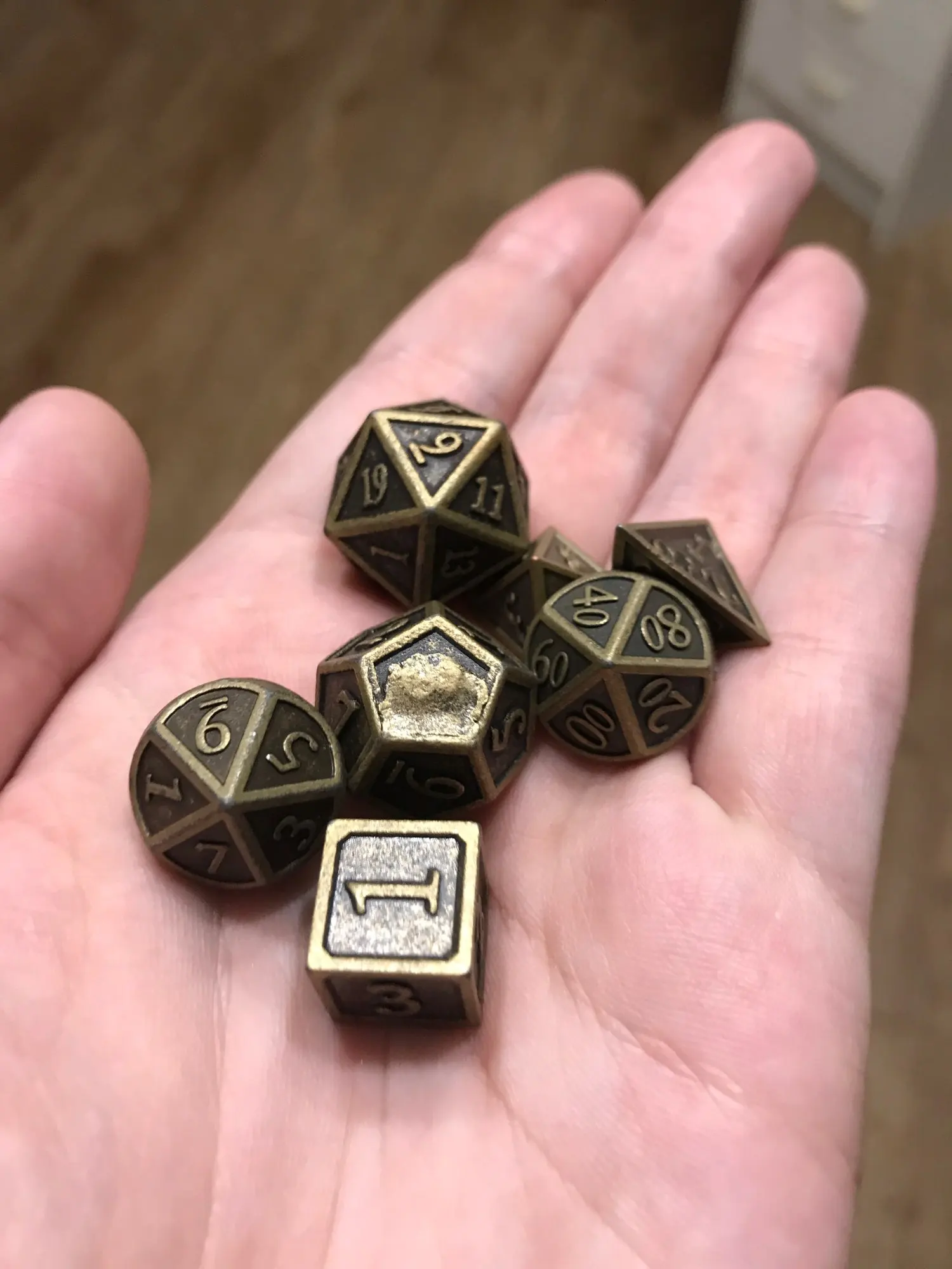 La taille des dés n'est pas homogène (le d8 et le d6 sont plus petits) La répartition des nombres n'est pas correcte sur tout les dés, normalement la face 1 doit être opposée à la face la plus élevée, ce qui n'est ici pas le cas pour les d10 et le d8 Seul le d20 et le d12 m'ont donné entière satisfaction