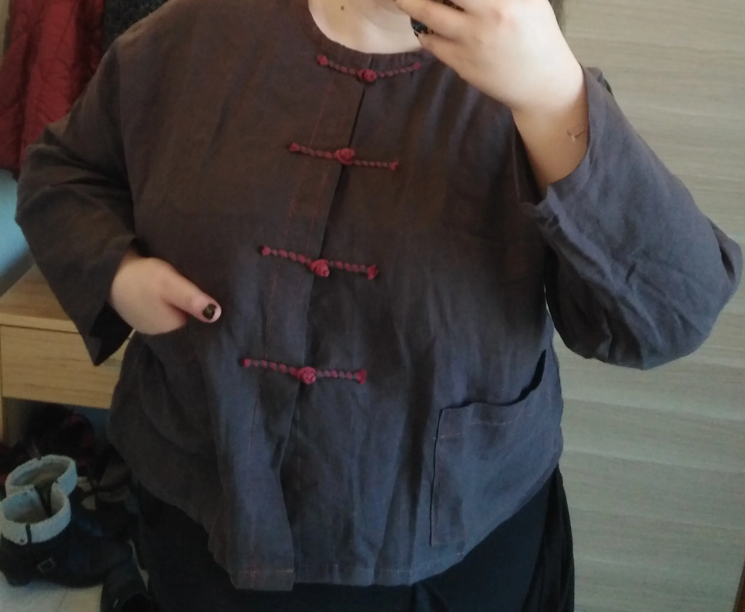 Johnature broderie Vintage chemises pour femmes lin Blouses lâches 2022 automne nouveau couleur unie bouton poches femmes chinois hauts