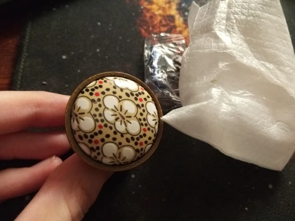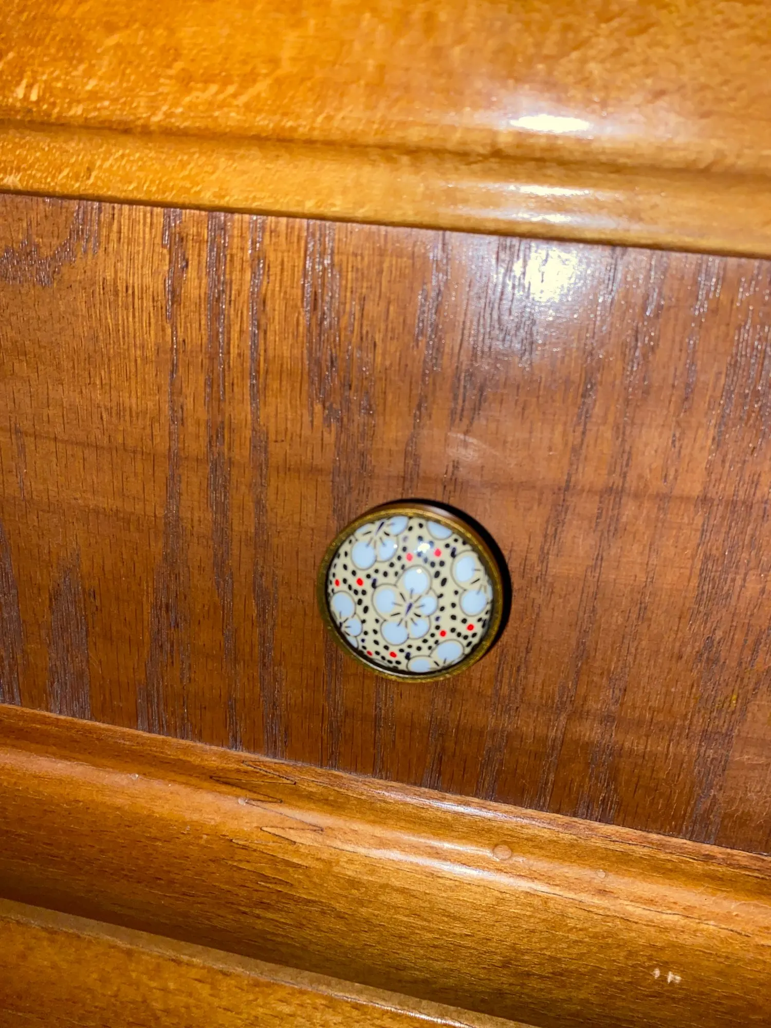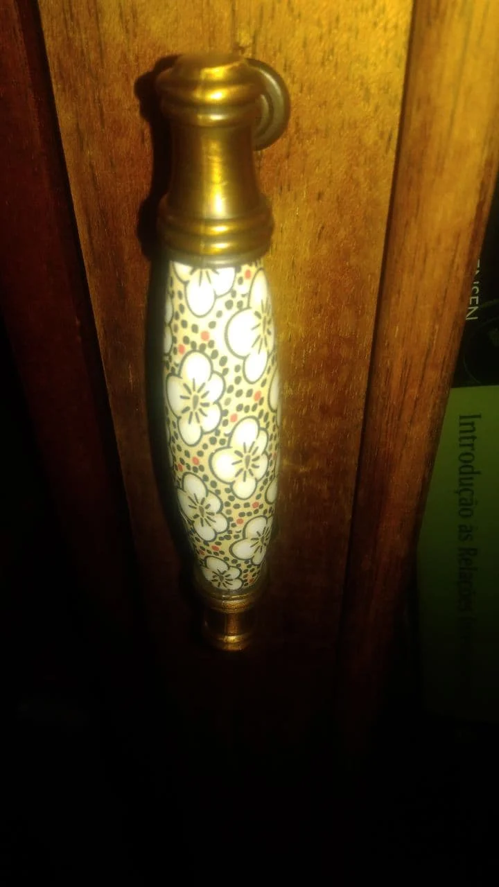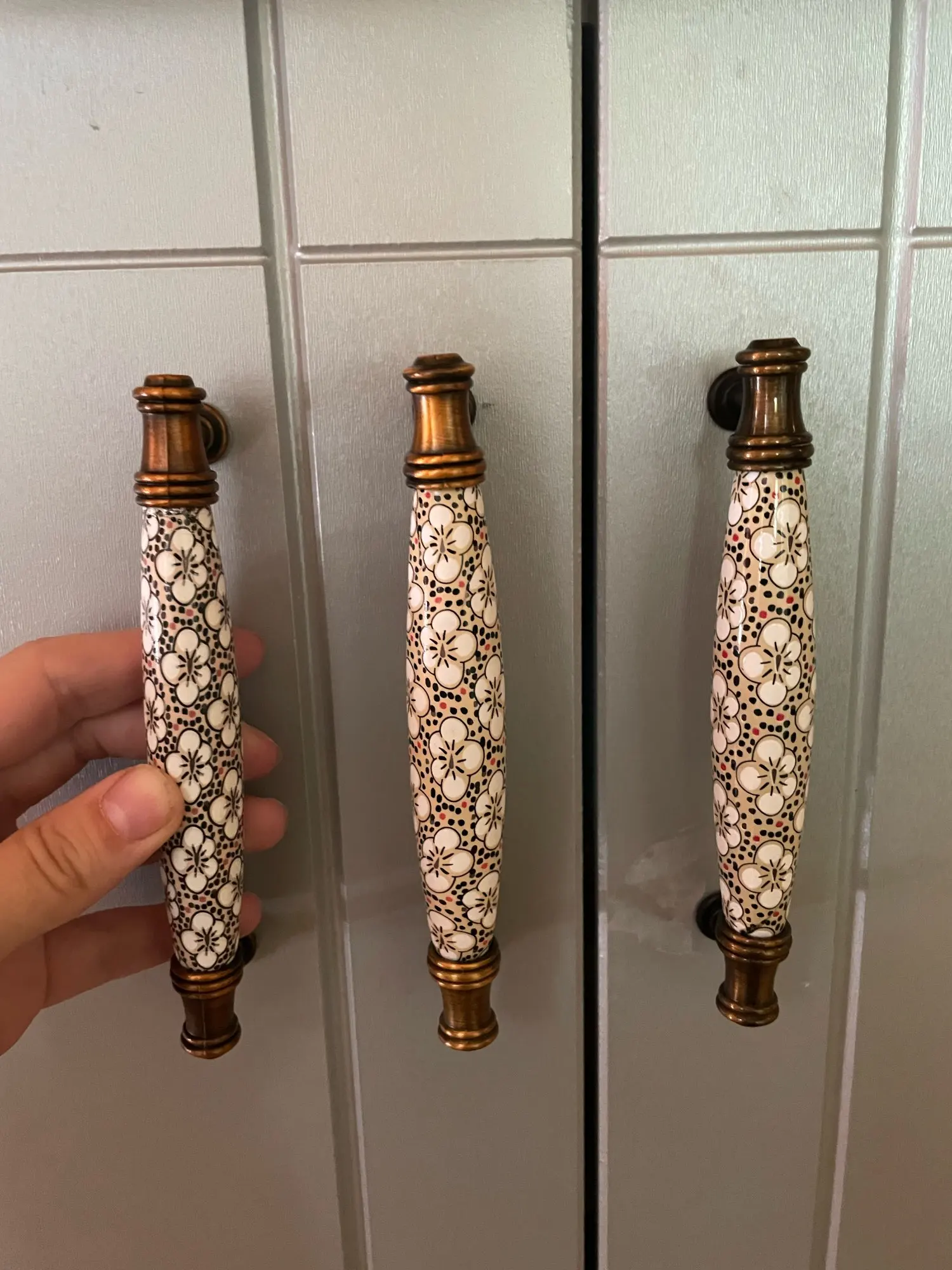 très belle poignée de porte en porcelaine peinte très élégante façon cuivre vieilli.