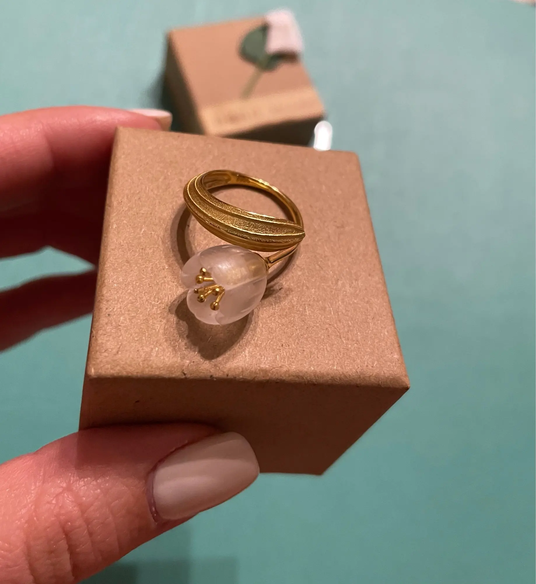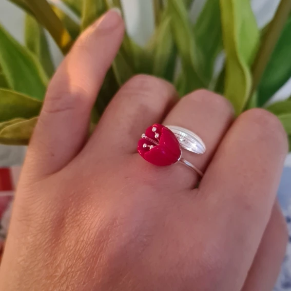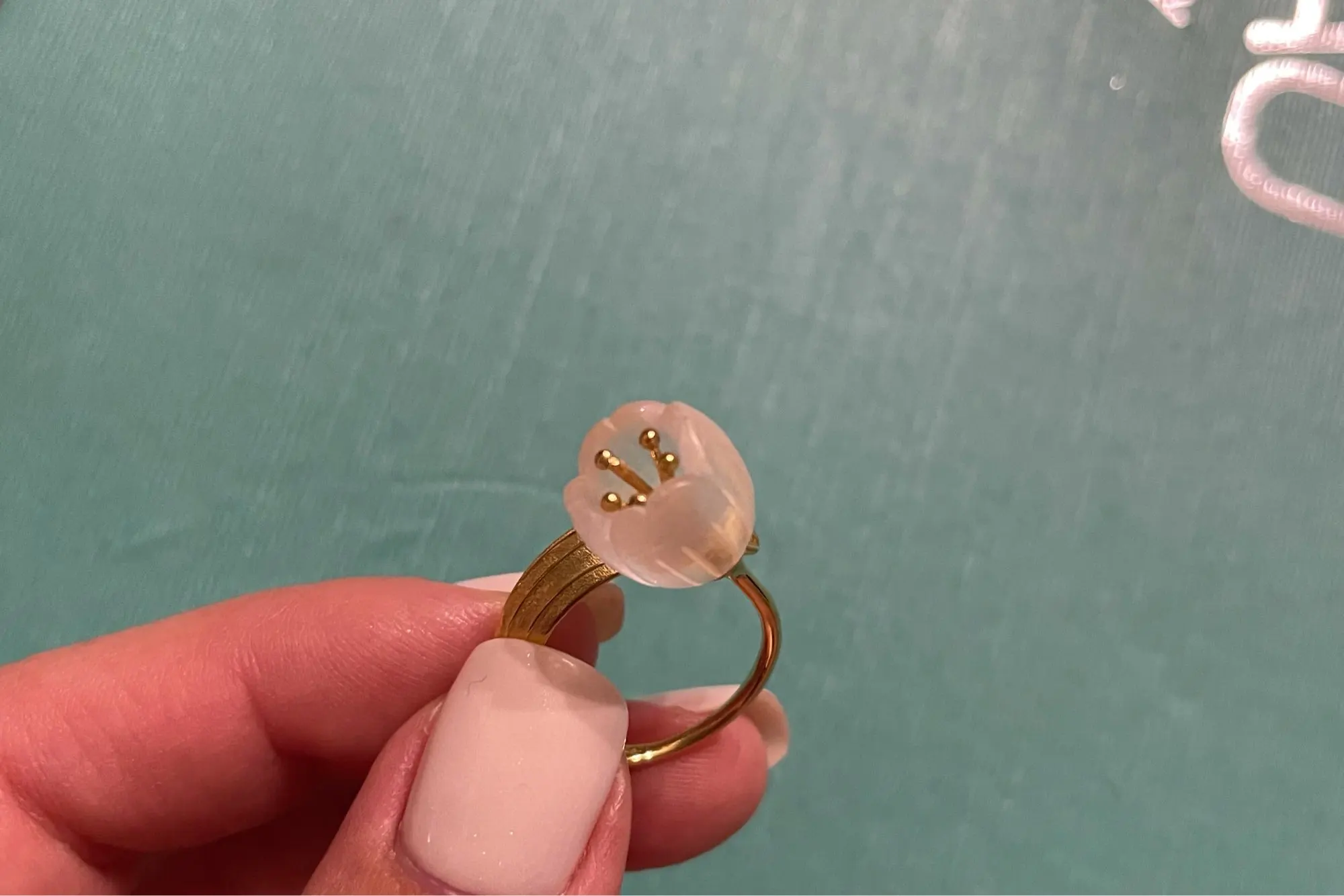 la fleur est opaque blanche. la bague est hyper légère, l argent est très fin et la fleur dépasse beaucoup.il faut faire attention à ne pas raccrocher sinon je pense qu elle va casser. l anneau est très grand, convient pour les gros doigts. arrivée rapidement en France en 2 semaines.