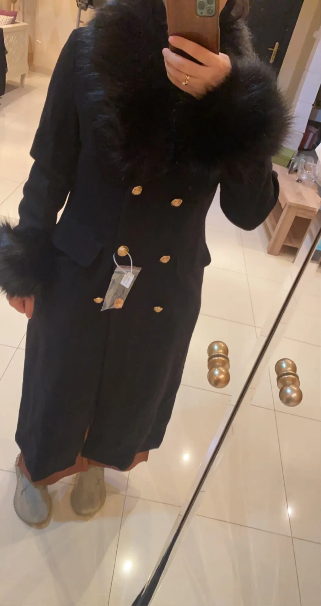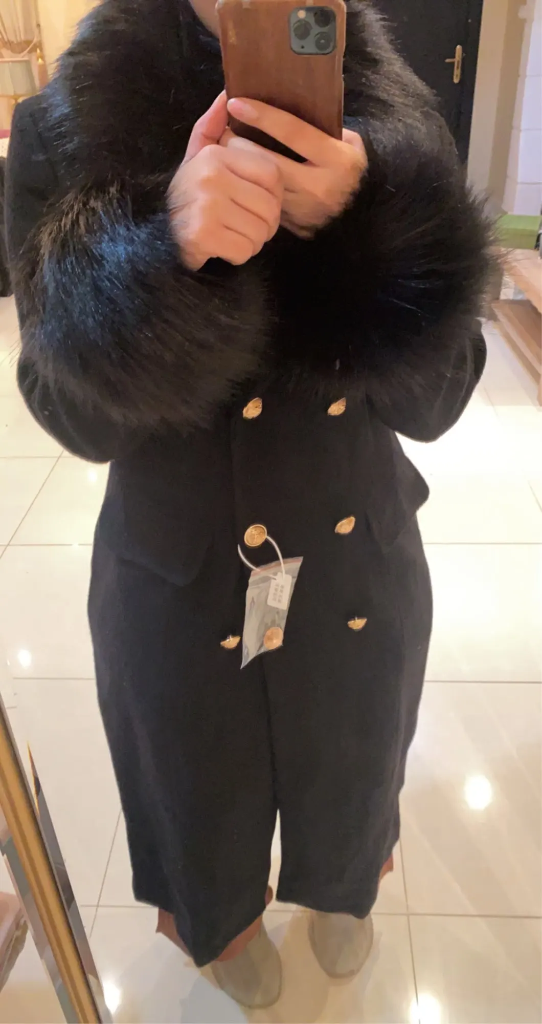 Manteau de laine pour femme, manteau en cachemire noir imitation haute avec col en fourrure de renard, double boutonnage, vêtement d'extérieur slim, hiver à la mode