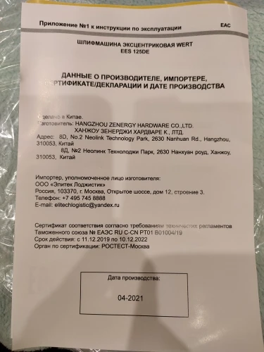 Meuleuse excentrique WERT EES 125DE 350W, f 125mm, 6000-13000 tr/min, amplitude 2.0mm, 1.4kg, p/rectifieuse outils électriques