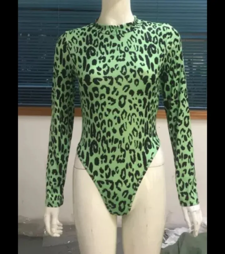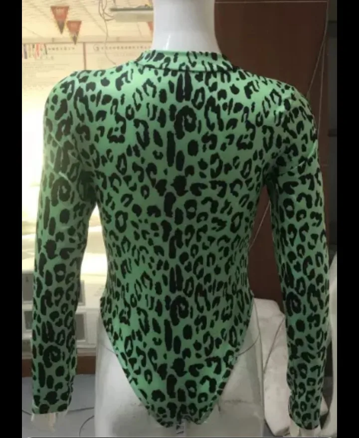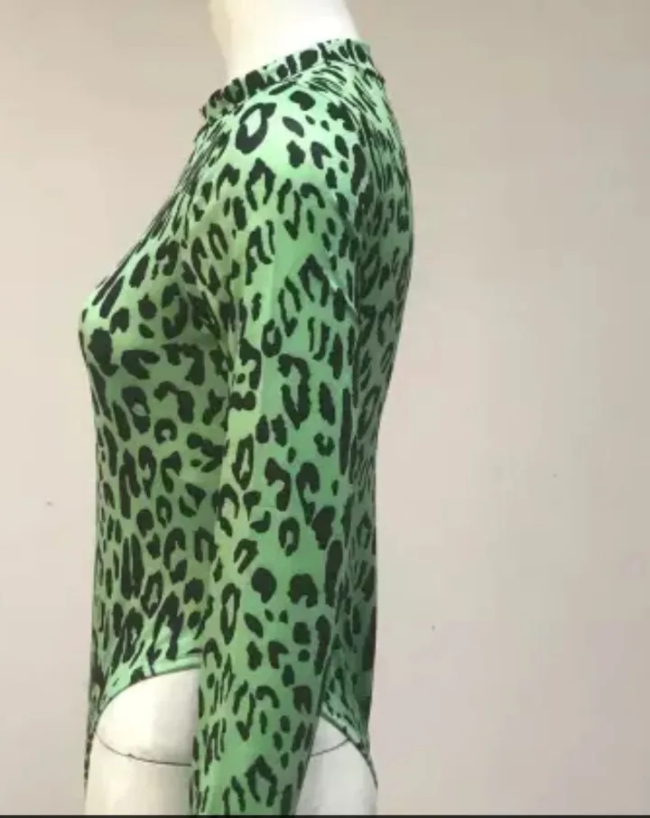 OMSJ mode automne néon vert dame à manches longues imprimé léopard body coupe haute Sexy combishort col roulé maigre une pièce barboteuse