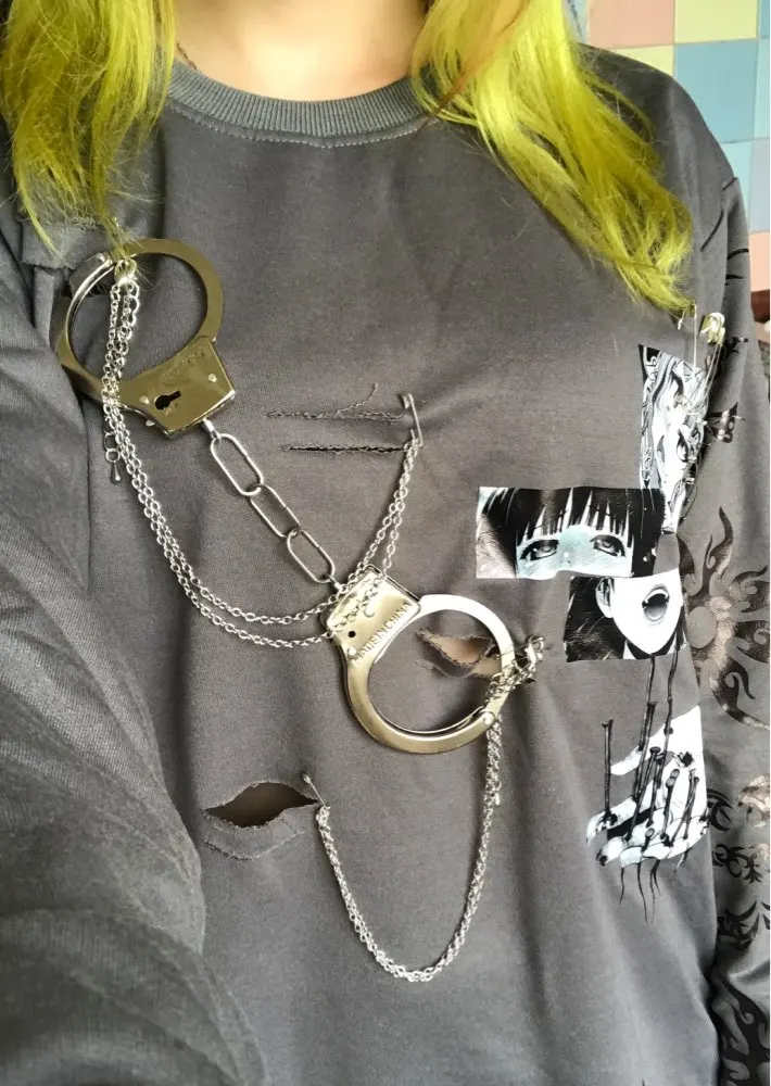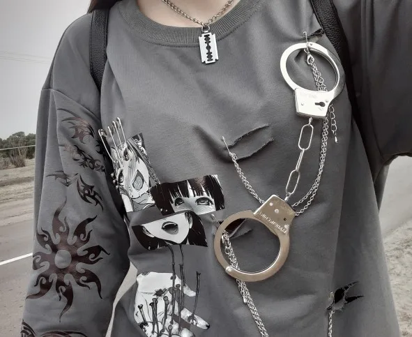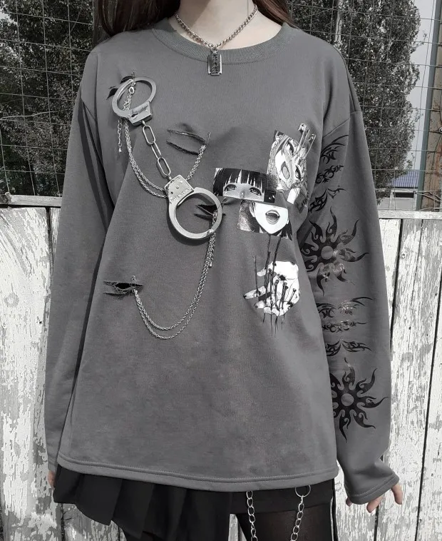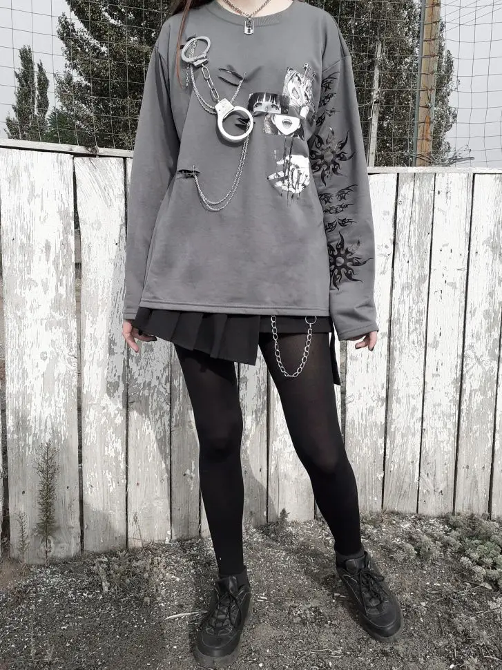 Original Design Punk gothique métal ample mi-long pull imprimé mince à manches longues japonais grands sweats grande taille gris