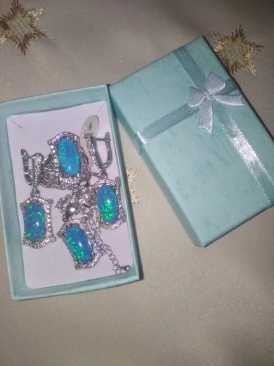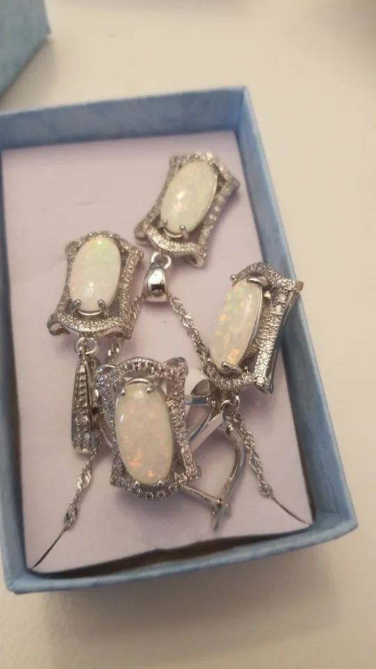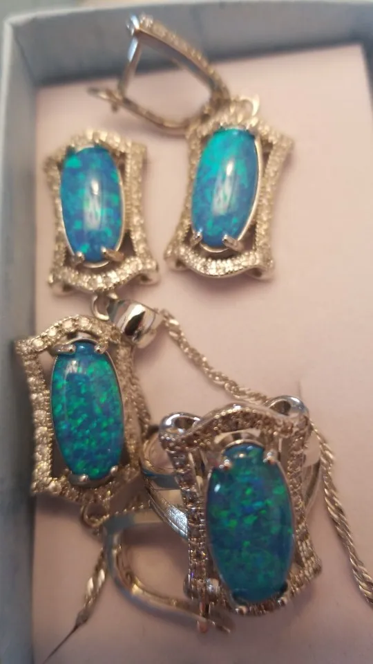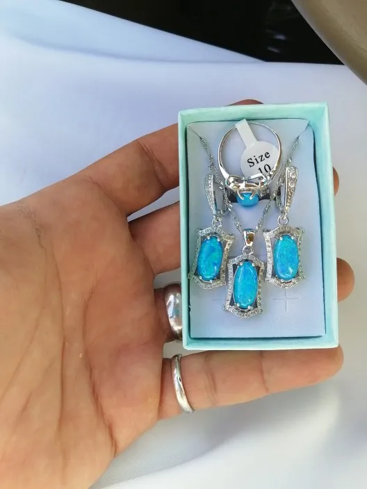 Parure de bijoux de mariée en opale bleue 95%, ensemble de bijoux pour femmes, collier, boucles d'oreilles, pendentifs, bagues, cadeau d'anniversaire, 925 de réduction