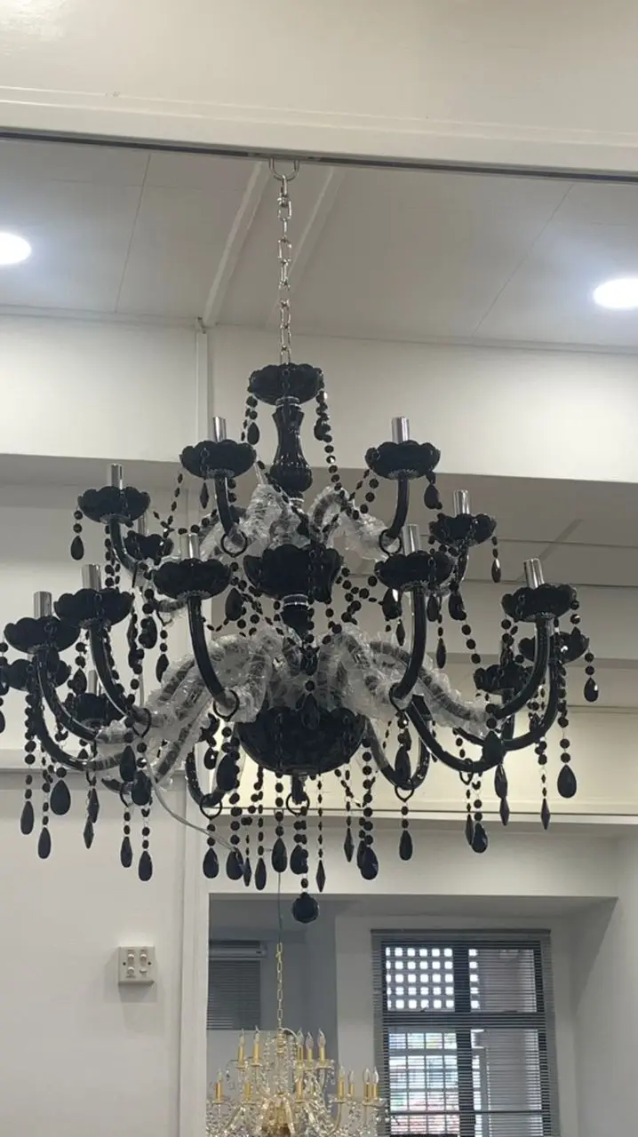 Plafonnier au design luxueux avec bras en cristal noir, composé de 18, 15, 10 ou 8/6 lampes, idéal pour un salon