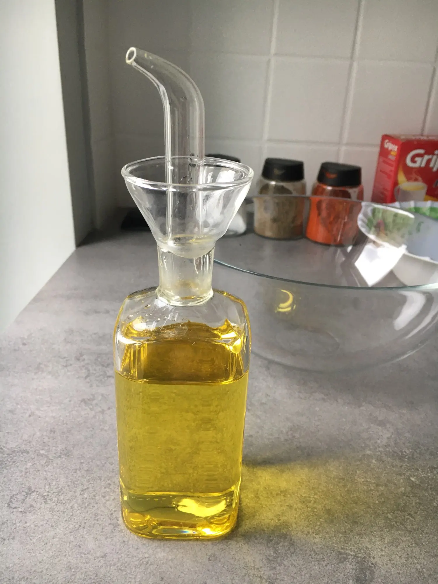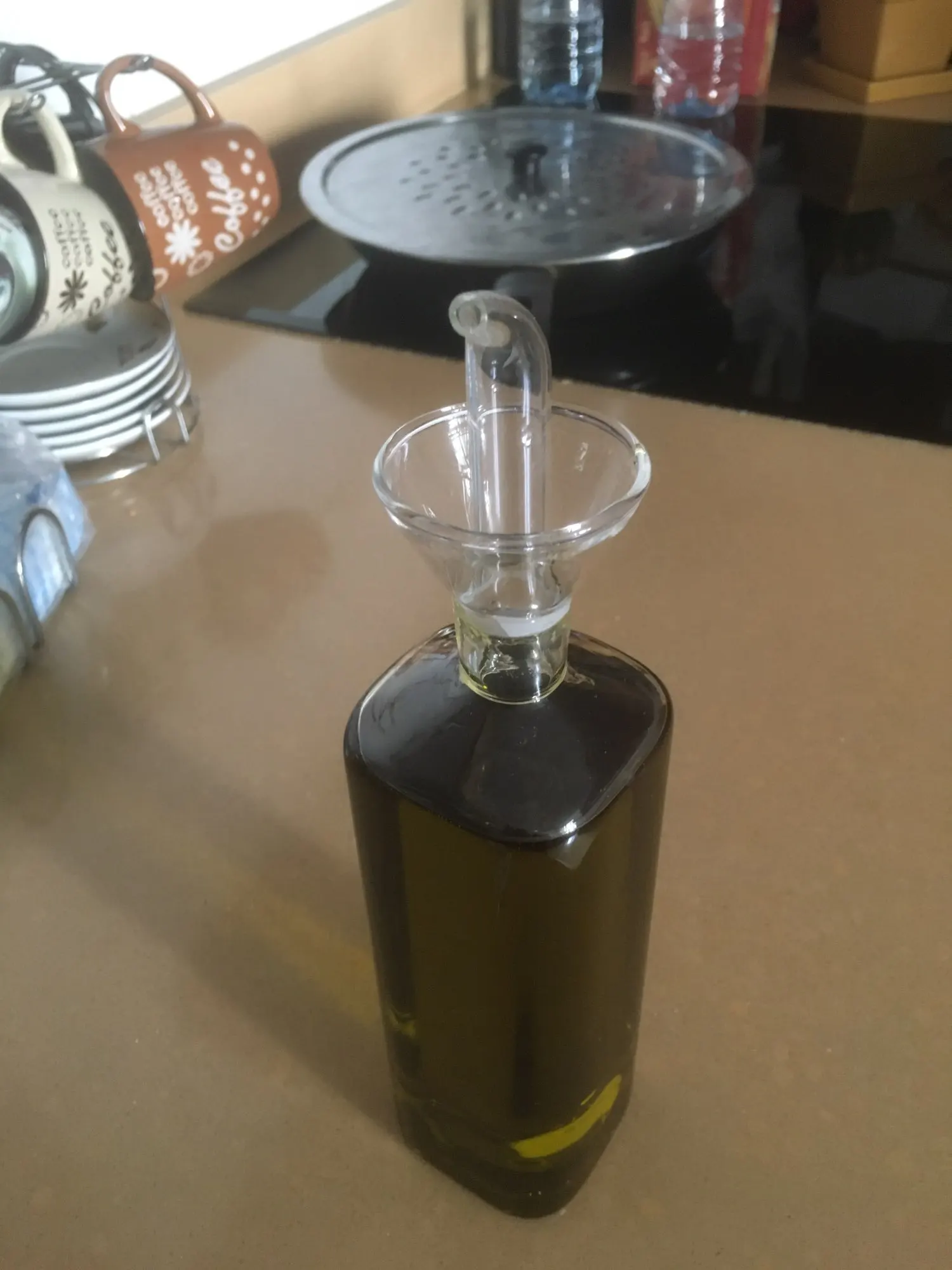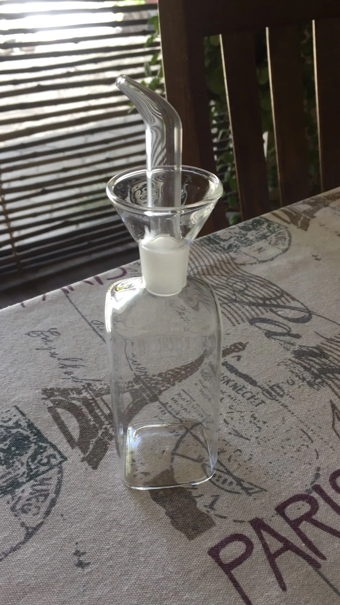 Conforme à la photo. Je pensais que le bouchon n’allait pas tenir car il n’y a pas de joint mais en réalité aucun problème. Le débit du liquide est bien. En verre donc pour moi plus hygiénique que le plastique. Je recommande