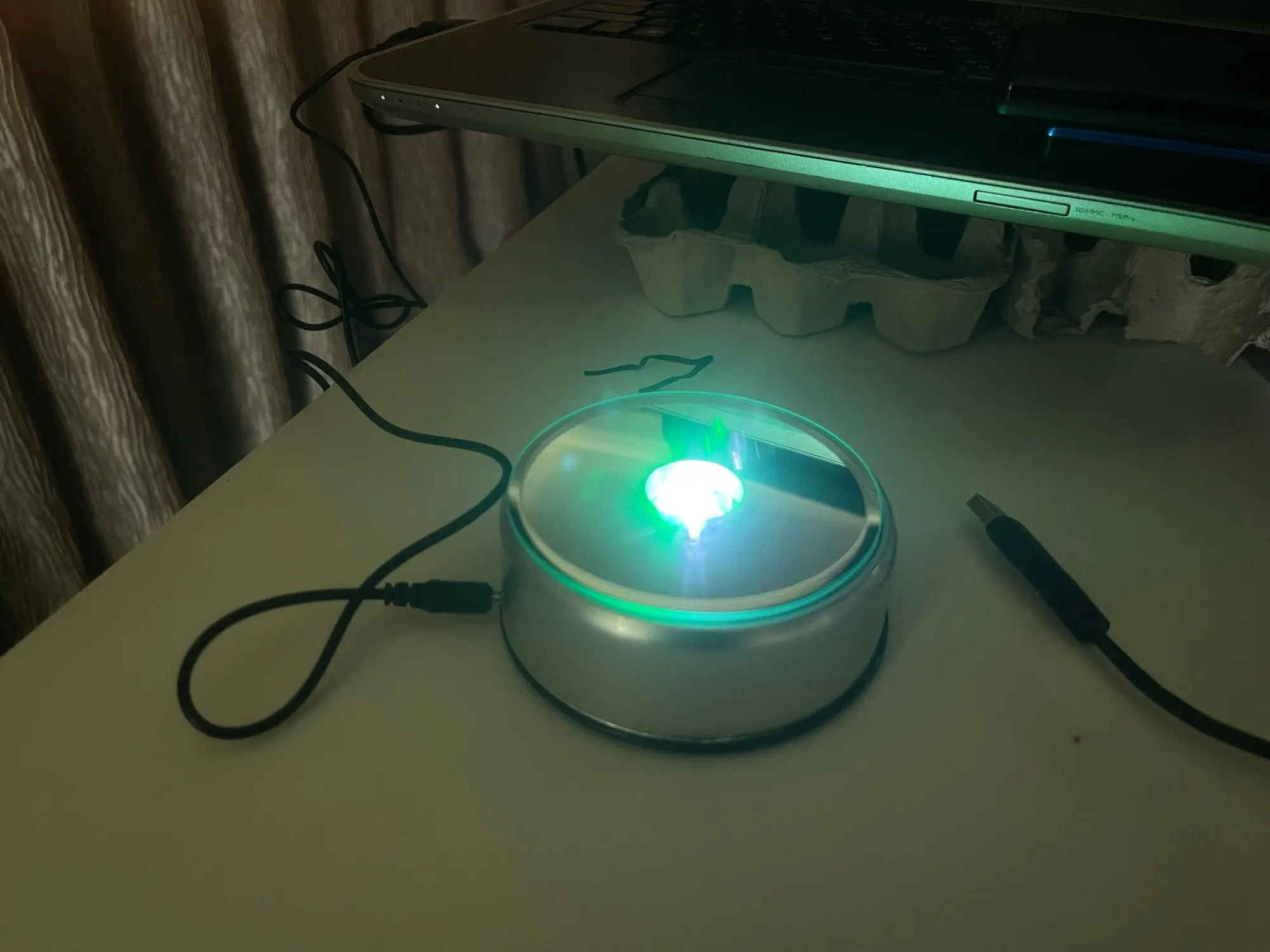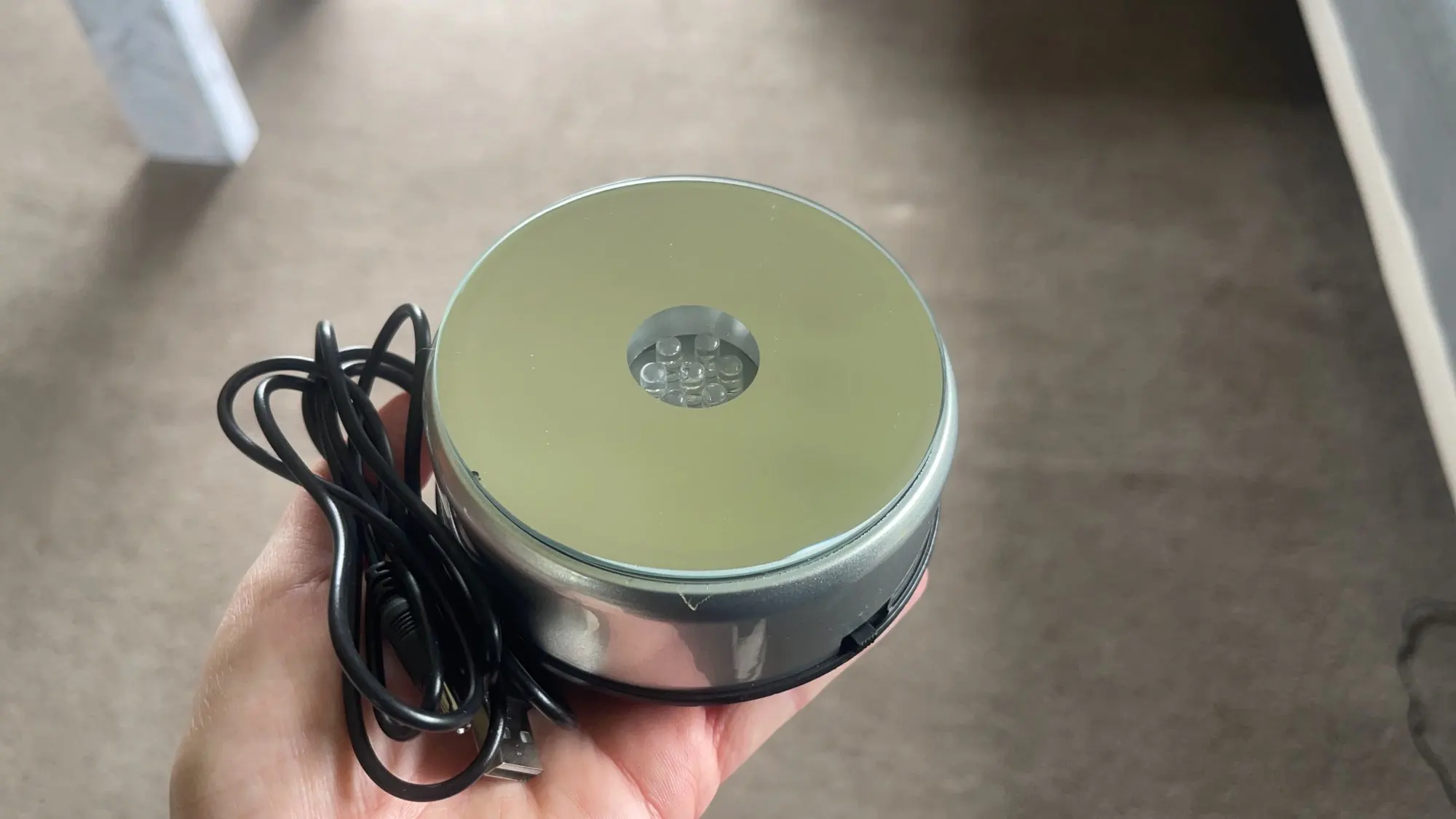 Bien, mais pas parfait ! Merci ! Superbe présentoir rotatif à miroir avec éclairages LED multicolores changeantes qui fonctionne sur secteur via un adaptateur USB ou sur piles (3 piles AA - LR6). Il va seulement falloir apprendre au vendeur que la France ne fait pas partie des États-unis, mais de l'Europe ! Car l'adaptateur fourni est avec prise US au lieu de prise EU... (Heureusement que j'en un d'autre pourvu de 4 ports USB, car utiliser 3 piles dans chacun des 4 supports rotatifs que j'ai acheté, ça fait beaucoup !). Interrupteur à 3 positions : OFF au milieu, ON sans rotation du plateau miroir à droite et ON avec rotation à gauche).