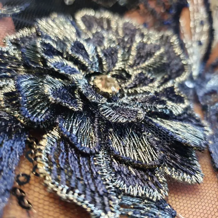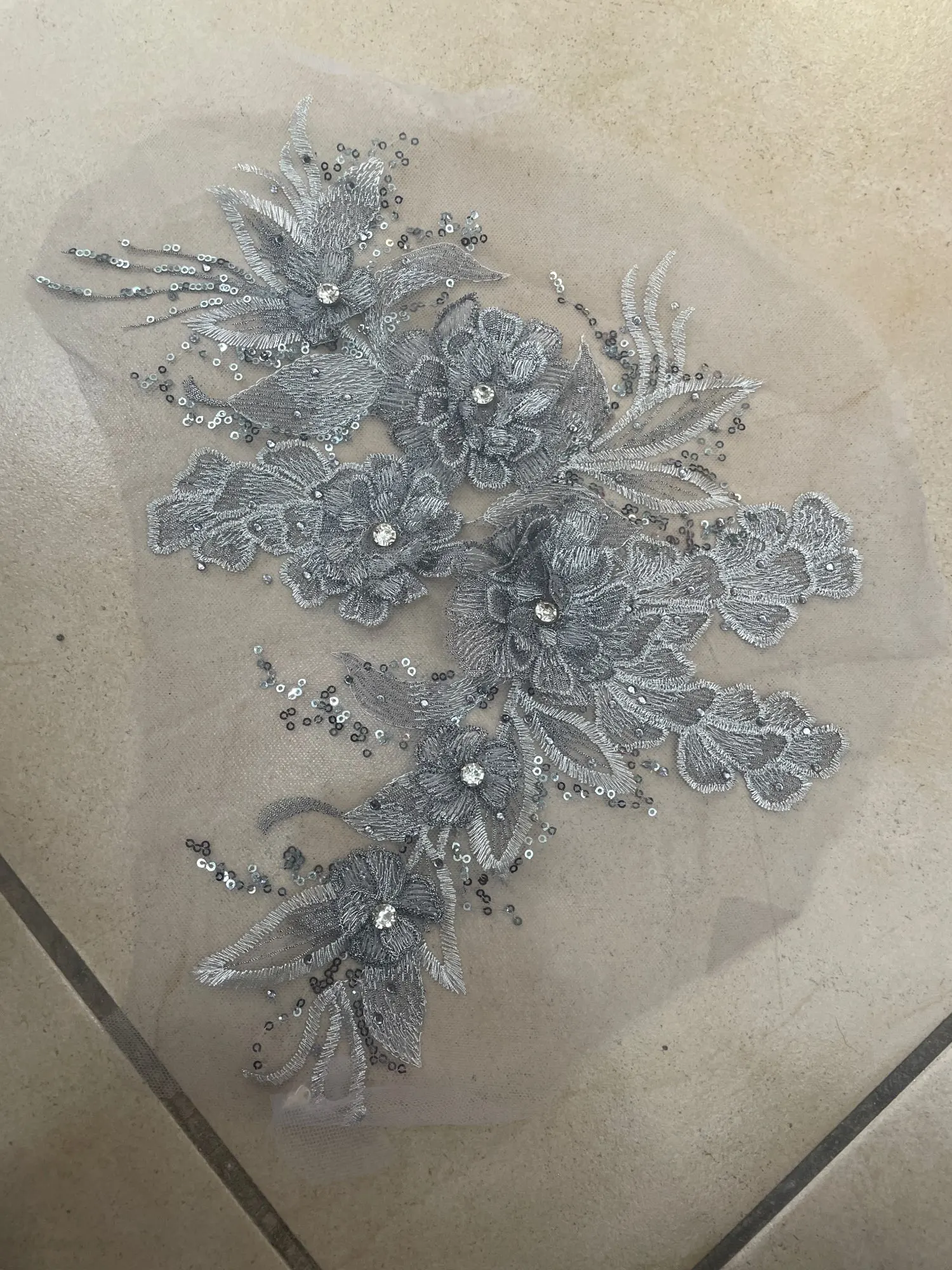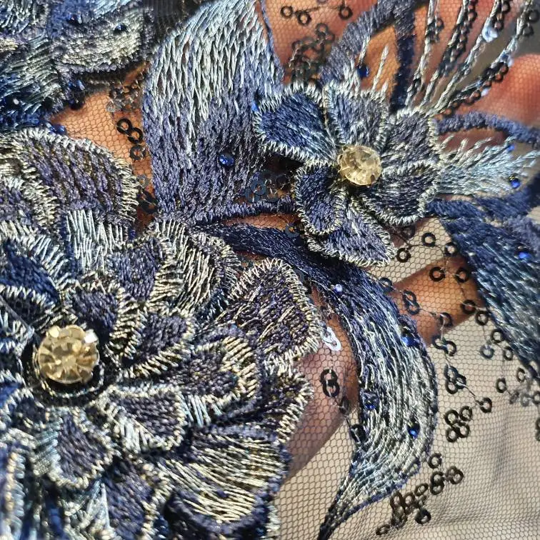 Robe brodée en dentelle de feuilles de fleurs 3D, grise, bleue, rouge, à paillettes, avec des Appliques, Patch de couture en maille pour décor de mariage