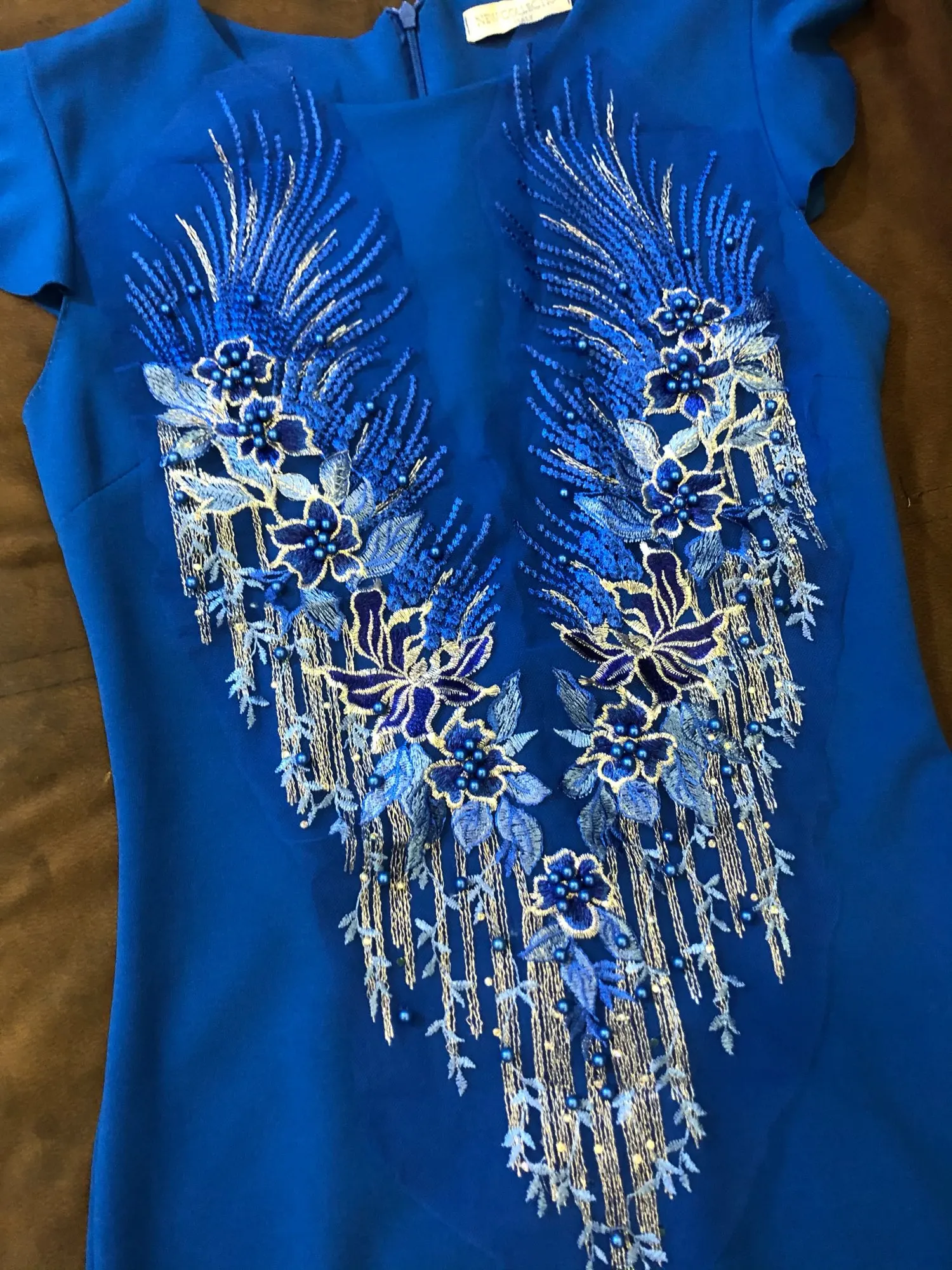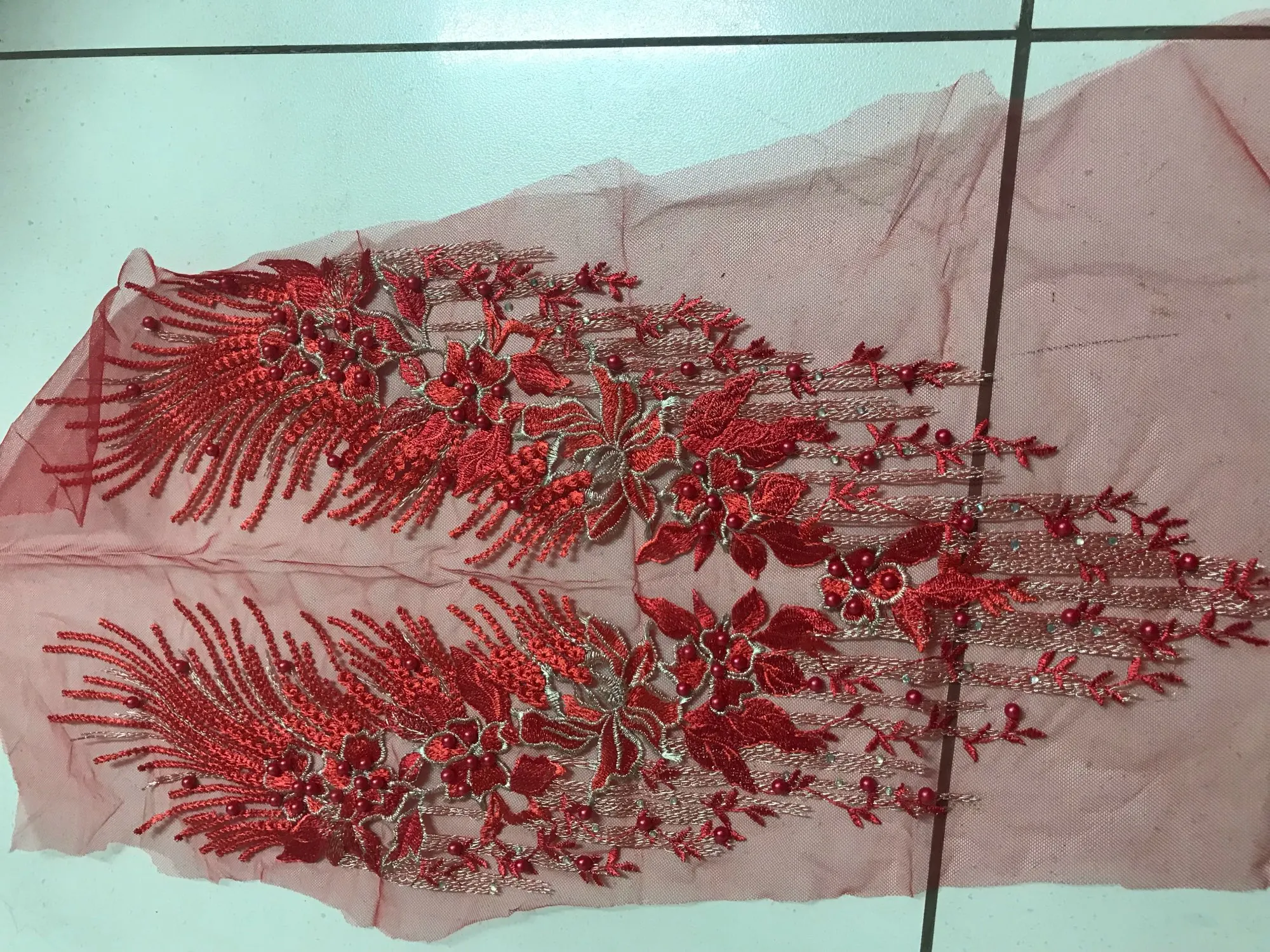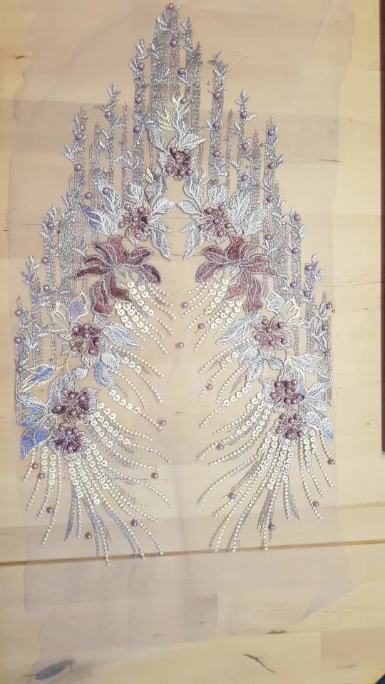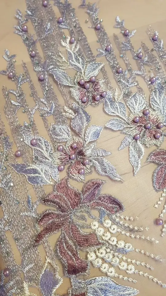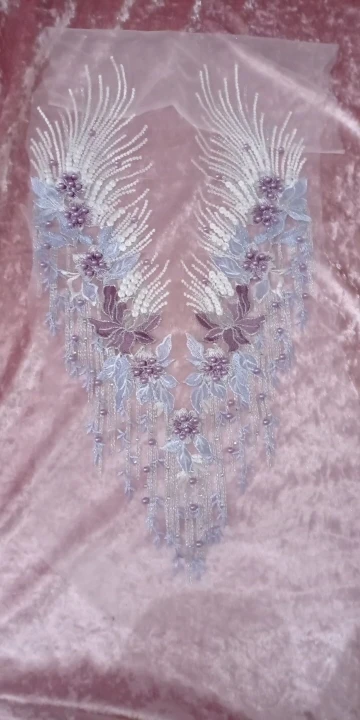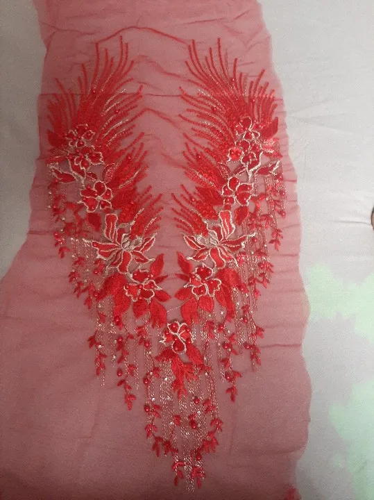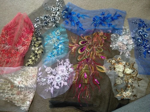Robe florale en dentelle brodée à pompon, tissu floral, Patch à coudre avec Appliques, perles et strass, décoration de mariage, bricolage-même, bleu rouge violet