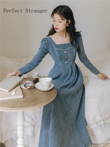 Robe longue en velours pour femme, tenue rétro à rayures et col carré, manches longues, nouvelle collection automne hiver 2022
