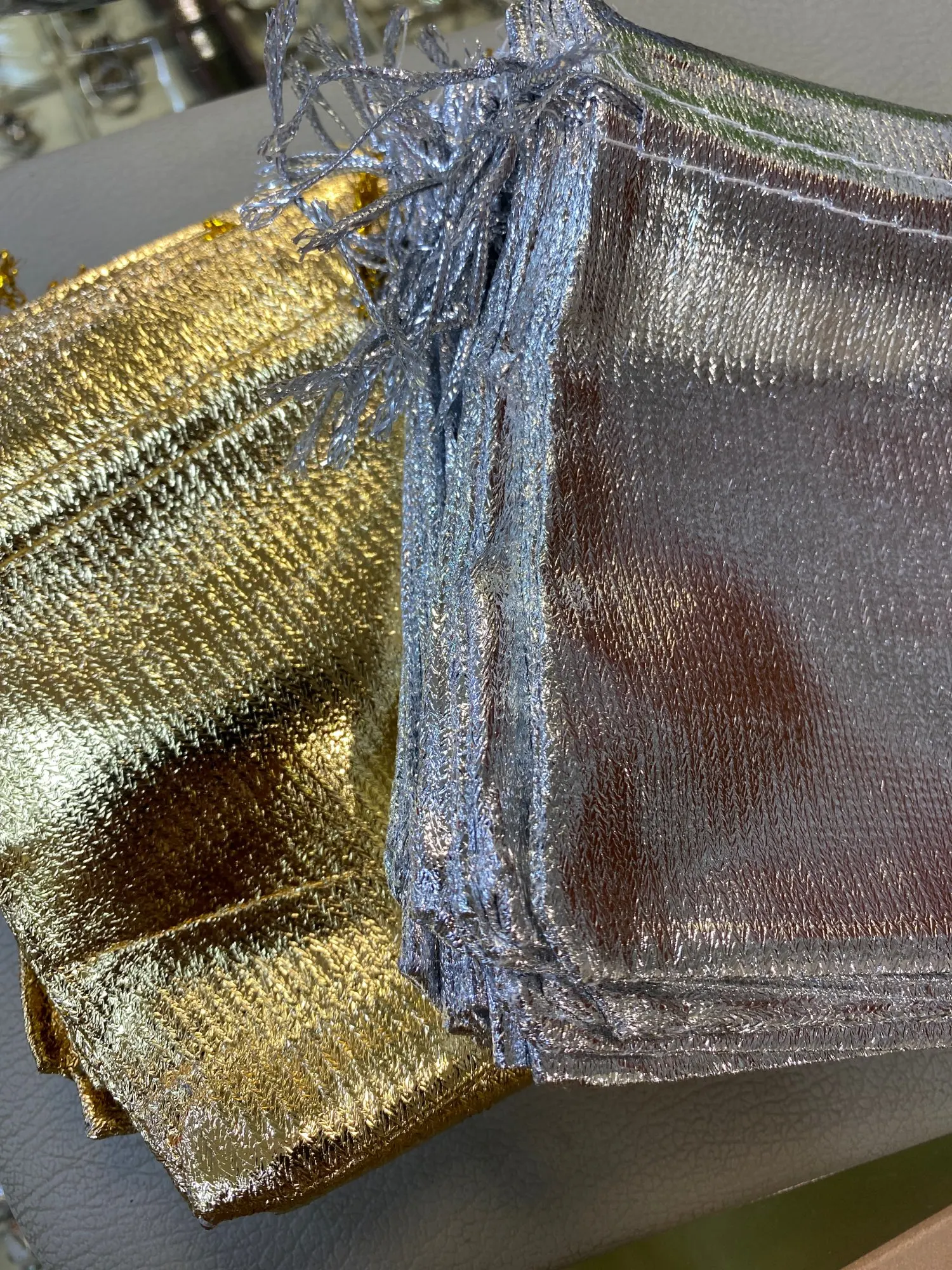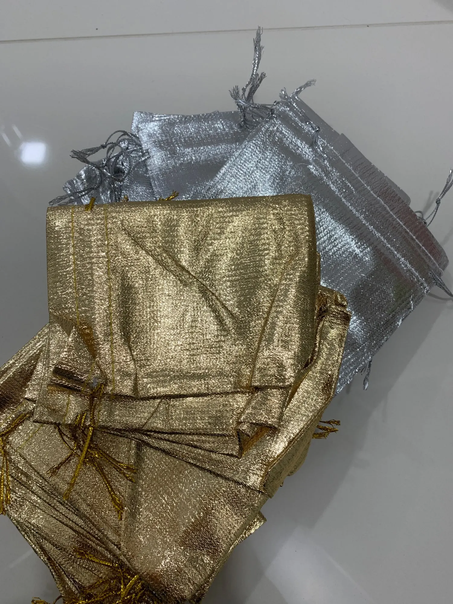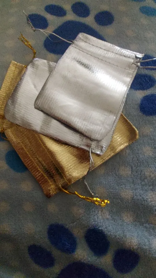 Sac de 50 pièces/sac, couleurs argent/or, emballage bijoux ajustables 7x9cm 9x12cm 10x15cm, sac à cordon, sachets cadeaux de mariage et pochettes