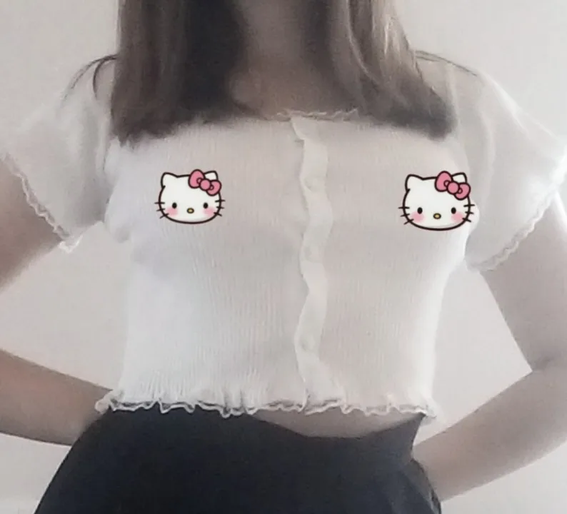 T-shirt à manches courtes col rond pour femme, tricoté, haut court, tendance, solide, doux, lacer sauvage, avec garniture à bouton