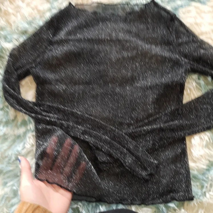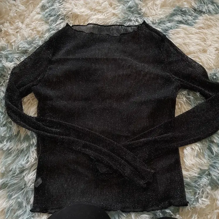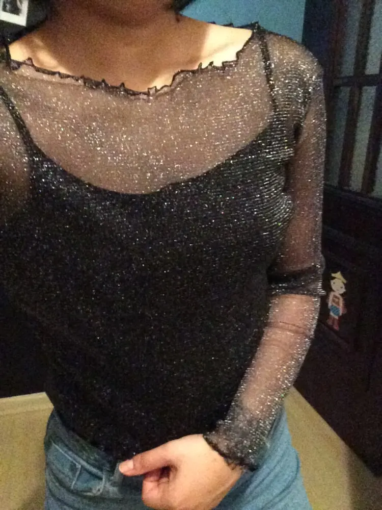 T-shirt Sexy à manches longues pour femmes, maille brillante, Transparent, Club, fête, noir, Sexy, mince, col rond, printemps
