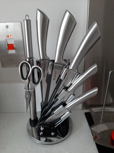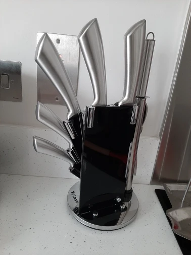 Velaze 8 pièces en acier inoxydable Cheaf viande Steak cuisine ensemble de couteaux ciseaux de cuisine aiguiseur de couteau avec porte-couteau tournant
