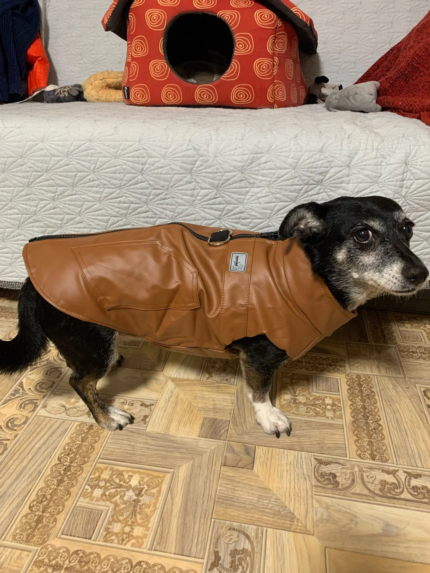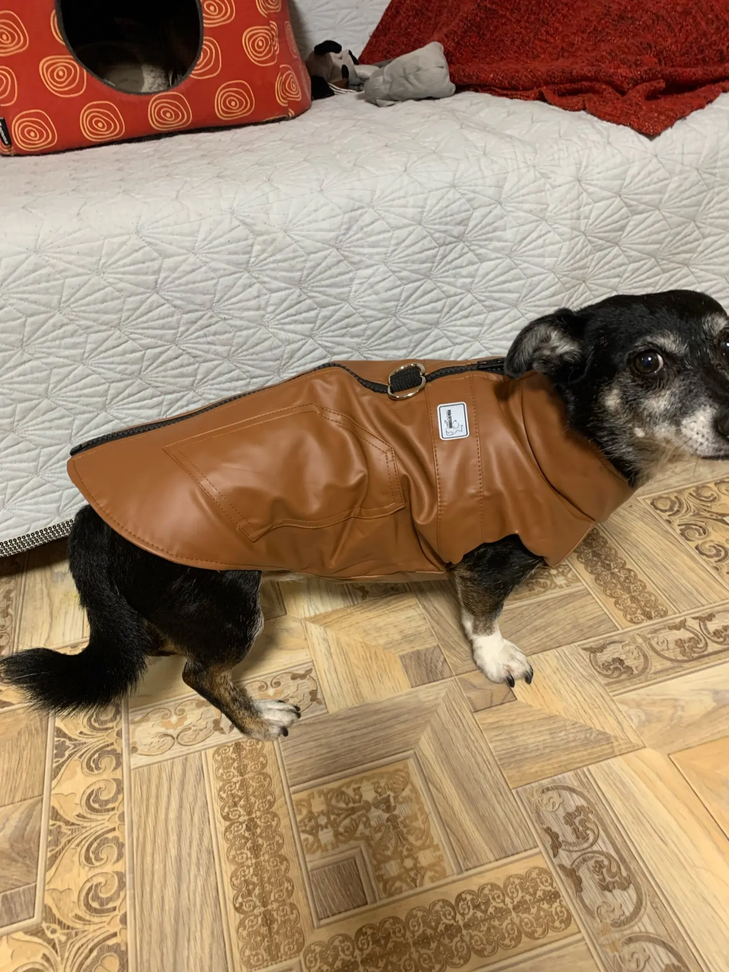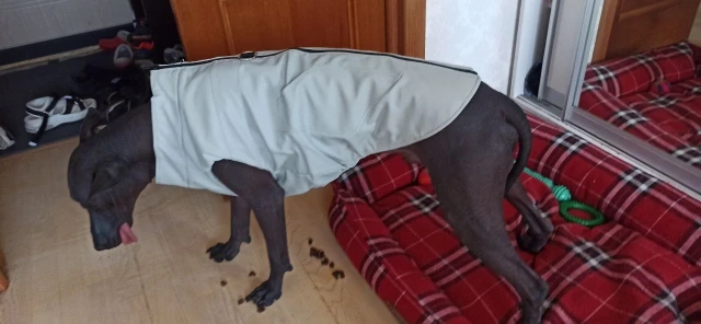 taille très bien , chaud et agréable au touché . je recommande . le petit anneau du dessus est très pratique pour remplacer le harnais (si le chien ne tire pas)
