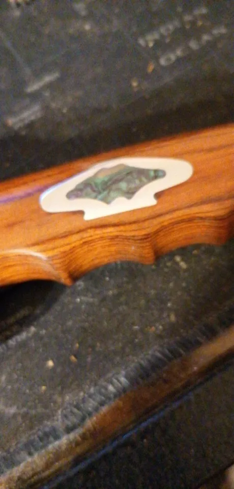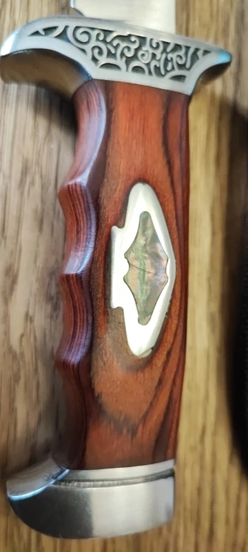 Une lame de 17 cm à 5 mm près sur 3 cm de large, une épaisseur de 4 mm au plus epais, la longueur du manche est de 11 cm,, je le trouve vraiment magnifique, je sais pas ce qui est incrusté de chaque côté du manche, je crois que ce sont des émaux, je vais me renseigner auprès du vendeur, pour 16 euros et quelques c'est un très beau couteau et de manufacture américaine, y a un petit drapeau près de la marque Columbia, je vais faire des recherches un peu plus poussées. Toujours est-il qu'avec un couteau comme ça Rambo peut aller se rhabiller. Non j'plaisante ! Il a une prise en main qui me convient parfaitement, la couleur du bois presque de la même teinte que mon cran d'arrêt qui est en Palissandre, un très joli bois rougeoyant qui provient d'un arbre qu'on trouve en Italie, j'adore les couteaux, pour moi qui suis sujet aux addictions ça peut coûter cher, je pense que ma collection va se limiter à ces 3 modèles, très bon rapport qualité prix.