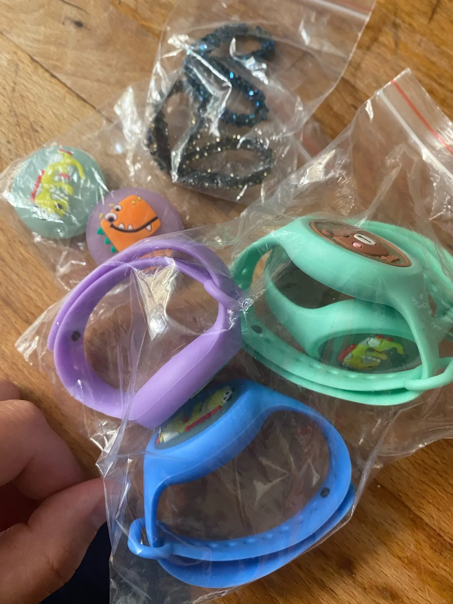 Bags/On hand/On feet/ Strollers and other places can be