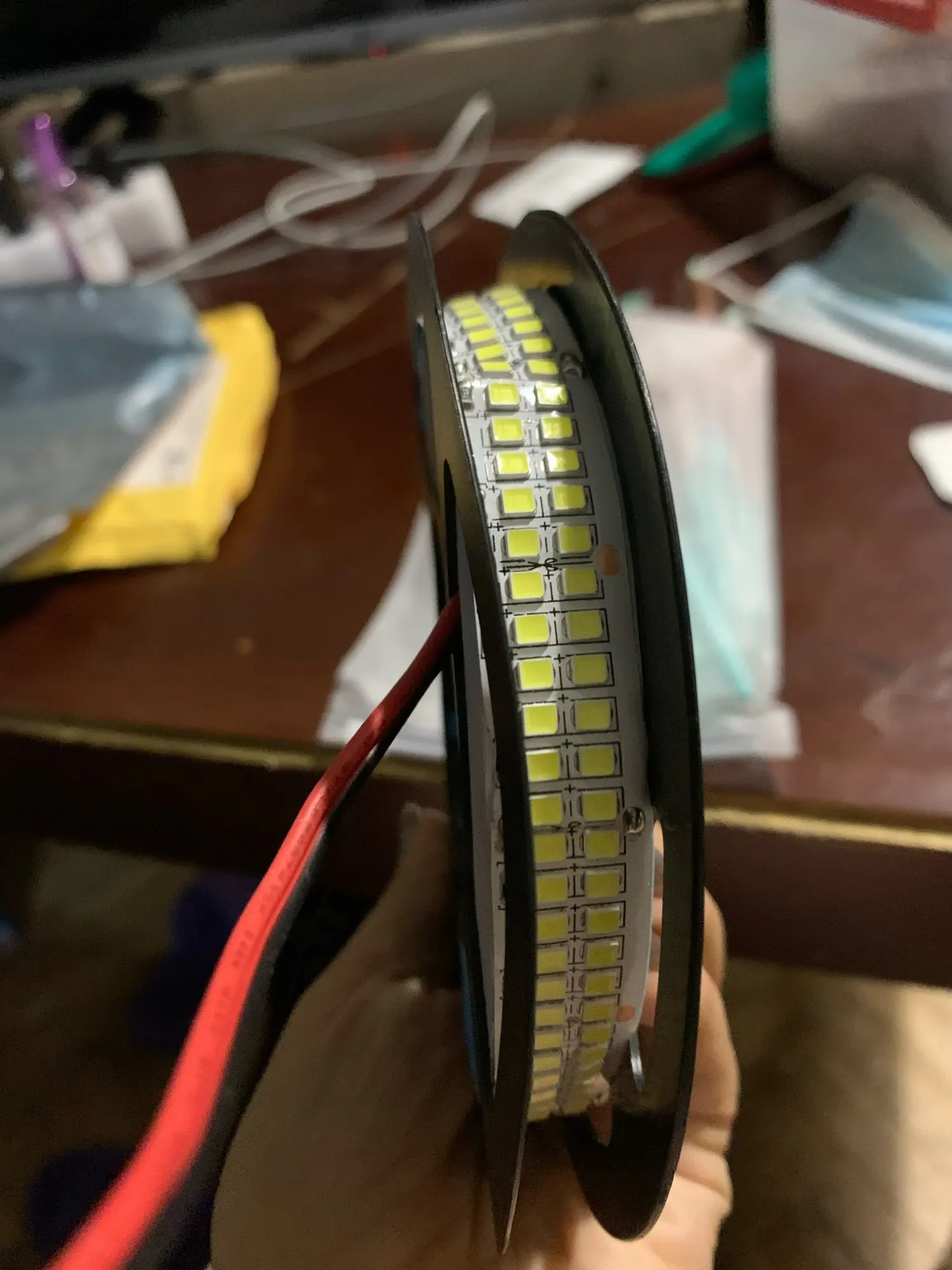 Светят ярко. Брал 3 метра. При 12.4 вольт ток 3.7 ампера. Клеить лучше на теплоотвод. Из минусов это не светились два диода. Пришлось отрезать одну ячейку и спаивать.