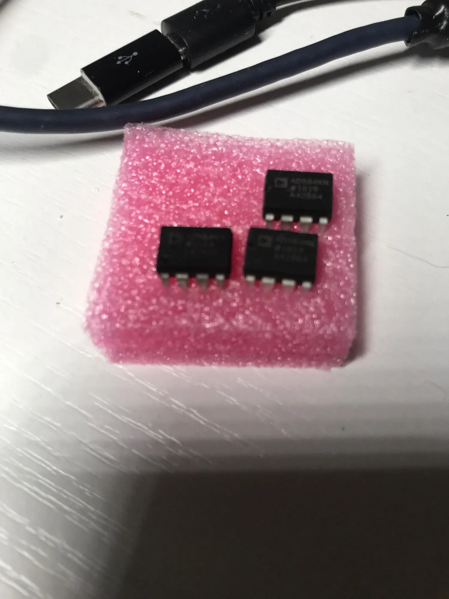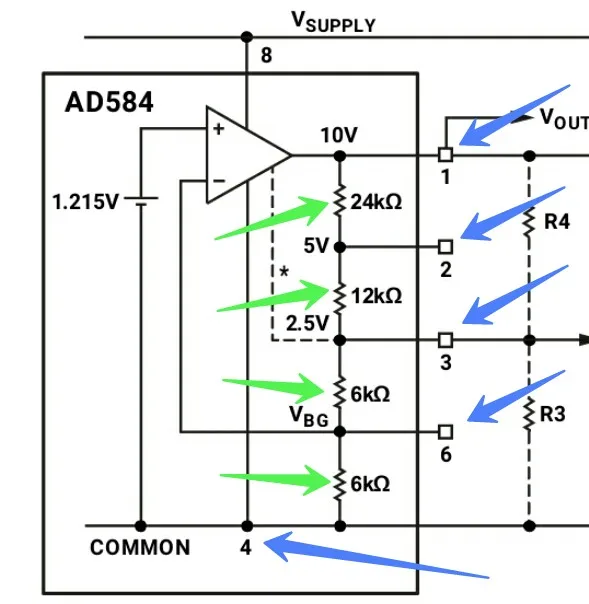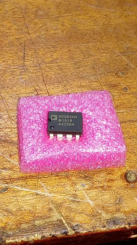 Прислали чіп в більш-менш пристойному зовнішньому стані. (див. фото) Чіп Б/В, зрозуміло, чи то 1994р., чи то 1995р. Чіп майже стовідсотково автентичний, і він працює, начебто навіть відносно непогано. Я перевірив відповідність внутрішніх резисторів чіпа зі схемою з даташита (див. пр. зображ.). З данимі даташита всі опіри збігаються. Всі напруги чіп видає, але у мене немає достатньо точного вольтметра щоб міркувати про точність цих напруг з упевненістю. До того ж незрозуміло, що у цього чіпа з низькочастотними (1/f) шумами. Шуми перевірити я поки не маю можливості. Eng: Salvaged authentic, not remarked.