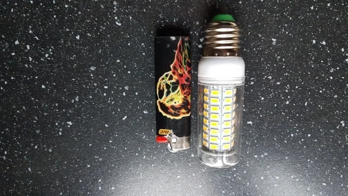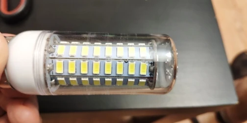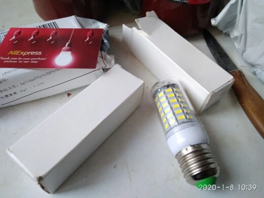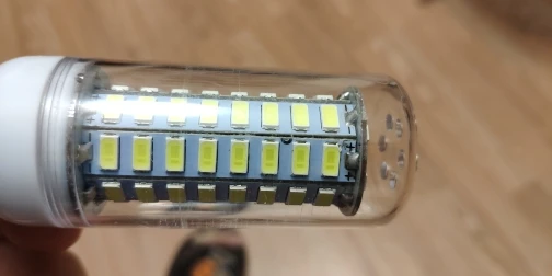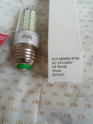 Свет от ламп белый, но недостаточно яркий. Одна лампа на 10 кв.м. не смогла достаточно осветить. Очень тусклый свет, несмотря на 72 диода. Лампы доехали работоспособные, хотя коробки были помяты, при этом имеются потёртости на лампах, что не свойственно, для новых ламп заводского происхождения (см.фото).