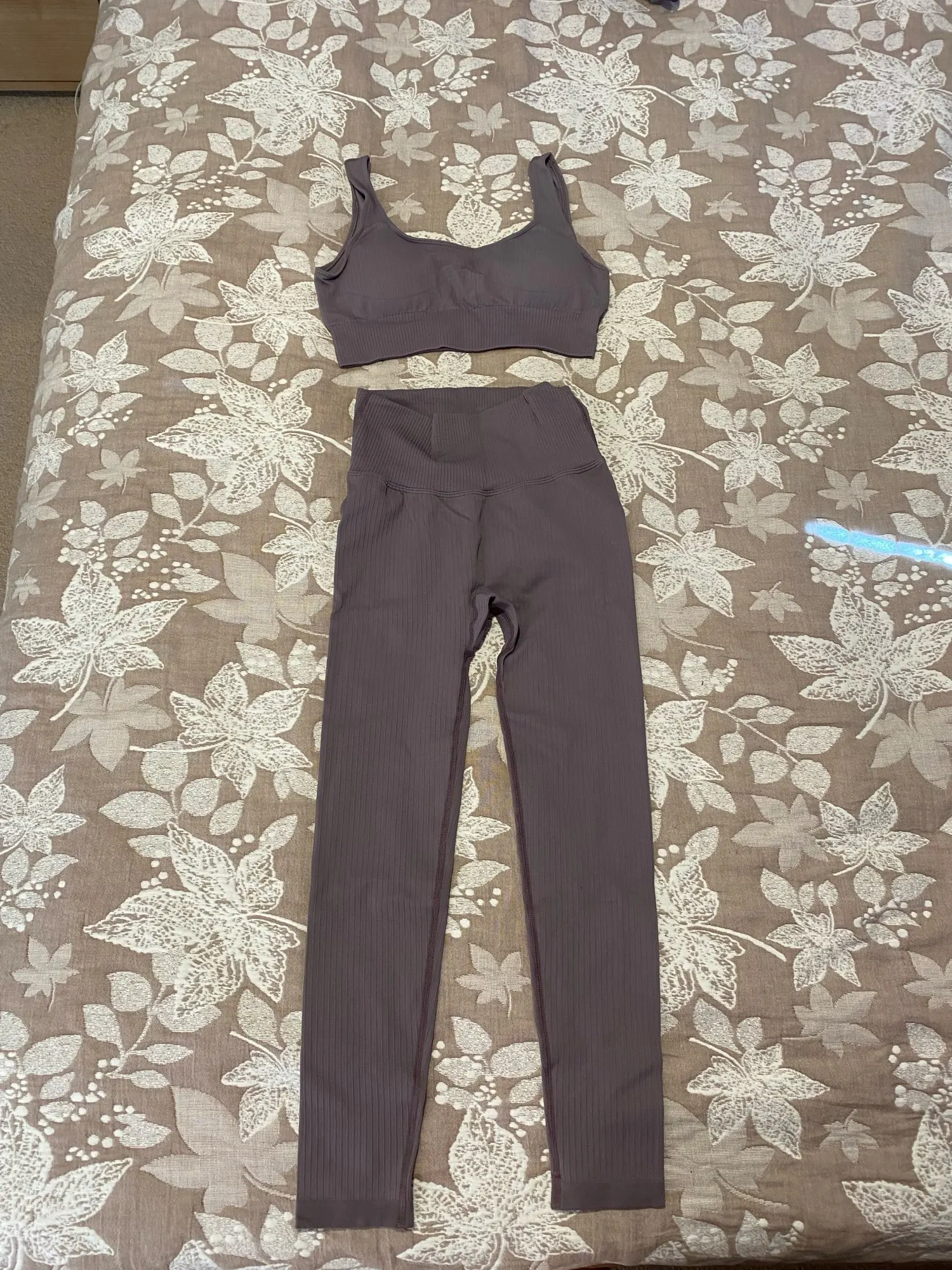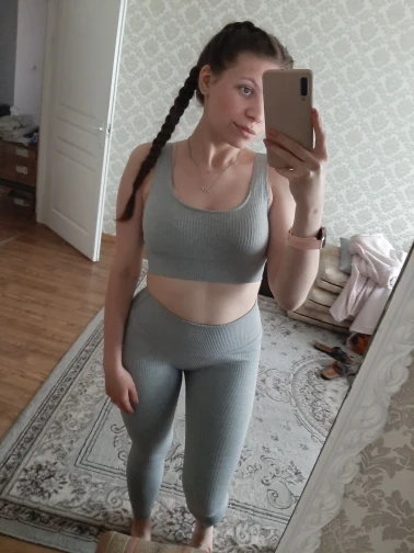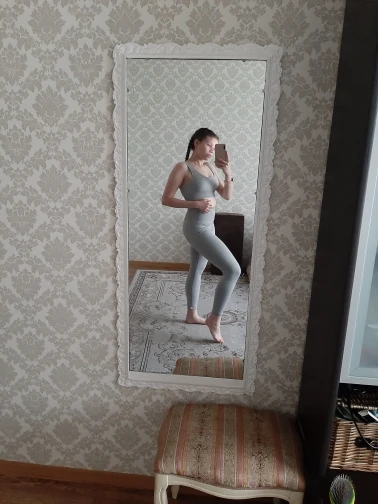 Плотный, непросвечивающий костюм. Топ хорошо поддерживает грудь во время тренировки. Единственное, леггинсы узковаты для меня, но терпимо. Дошёл быстро.