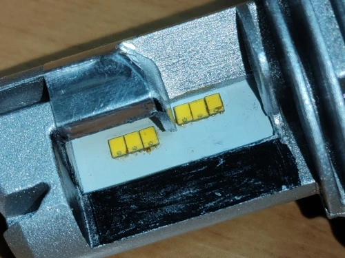 Светодиоды качественные. упаковка - в пакетик. Большая медная площадка, видимо для охлаждения, мешает припаять светодиоды к плате, так как перекрывает дорожки + и -. Что бы не было короткого замыкания , пытаюсь распилить площадку пополам. Распилить площадку возможно, но очень сложно.