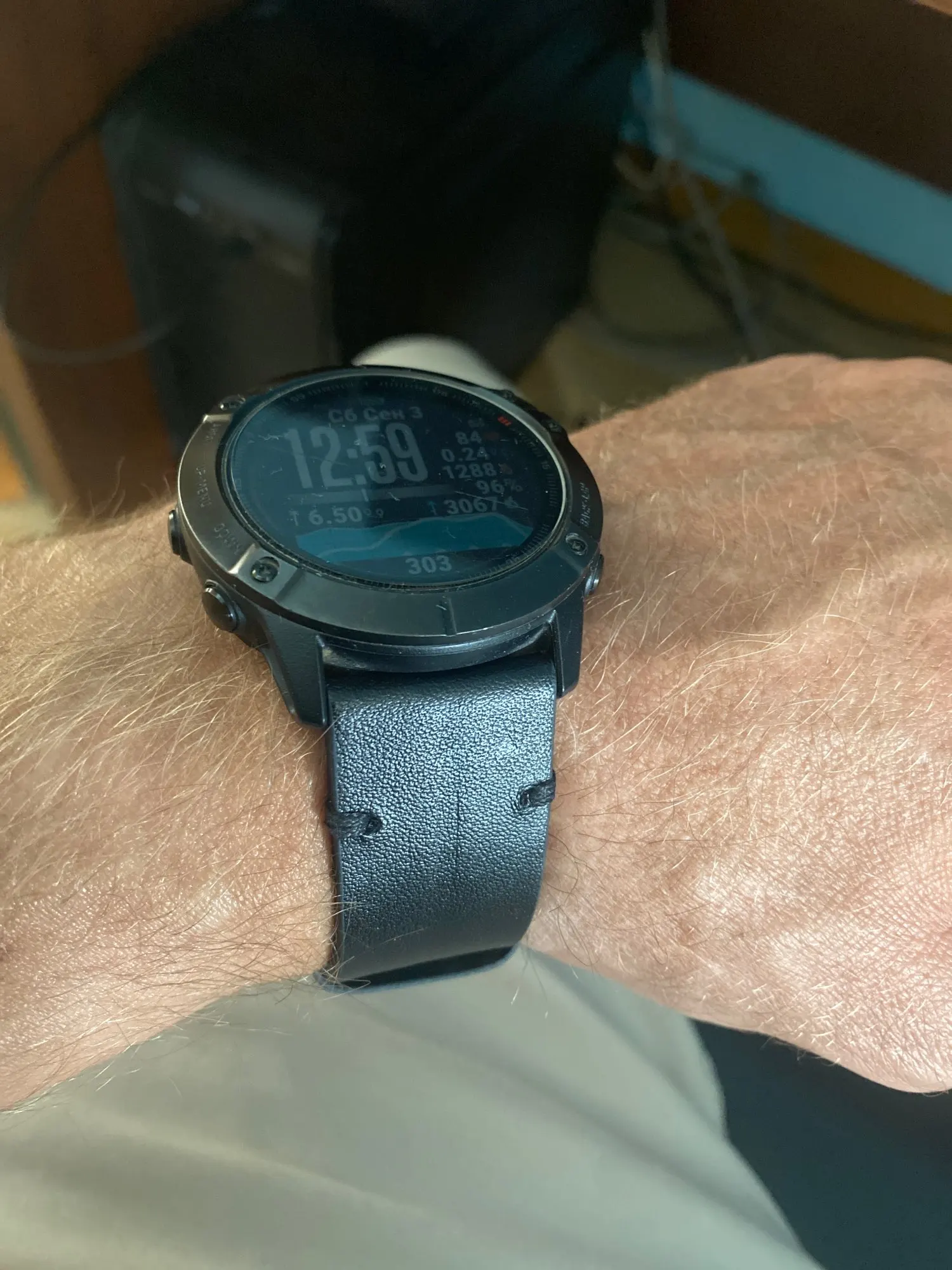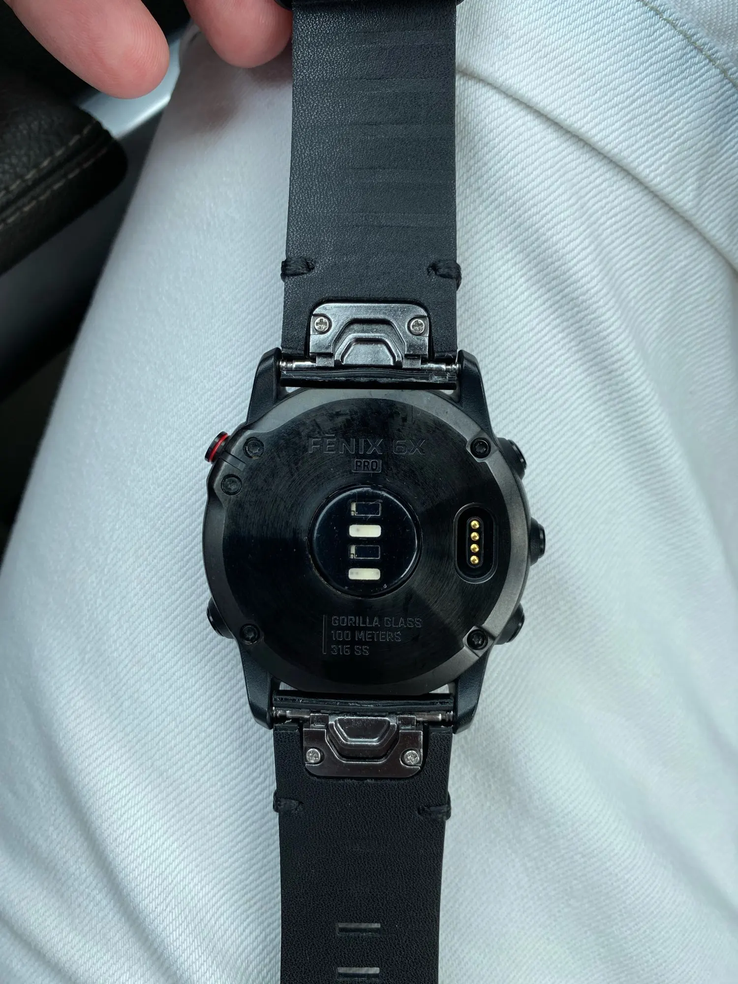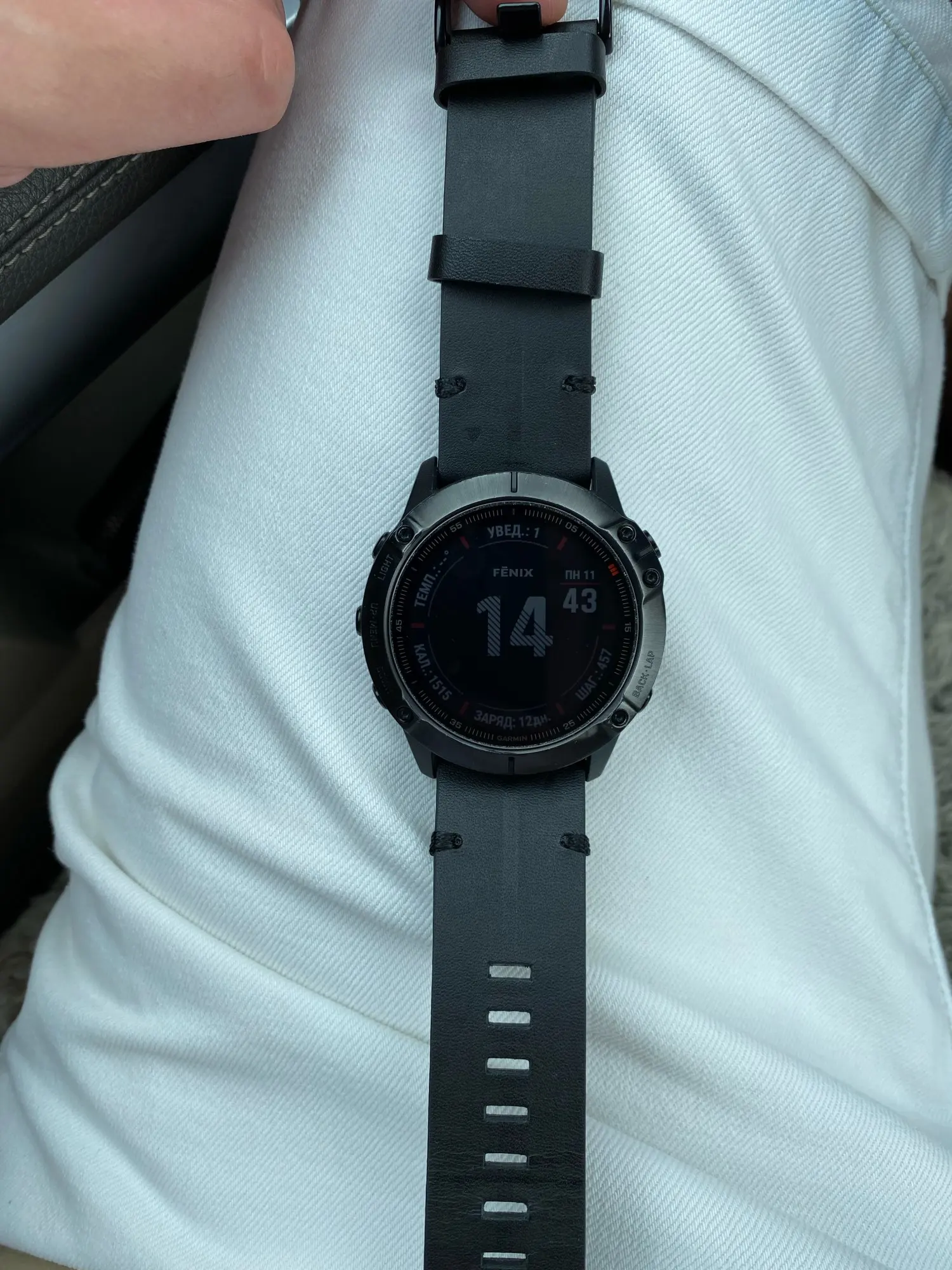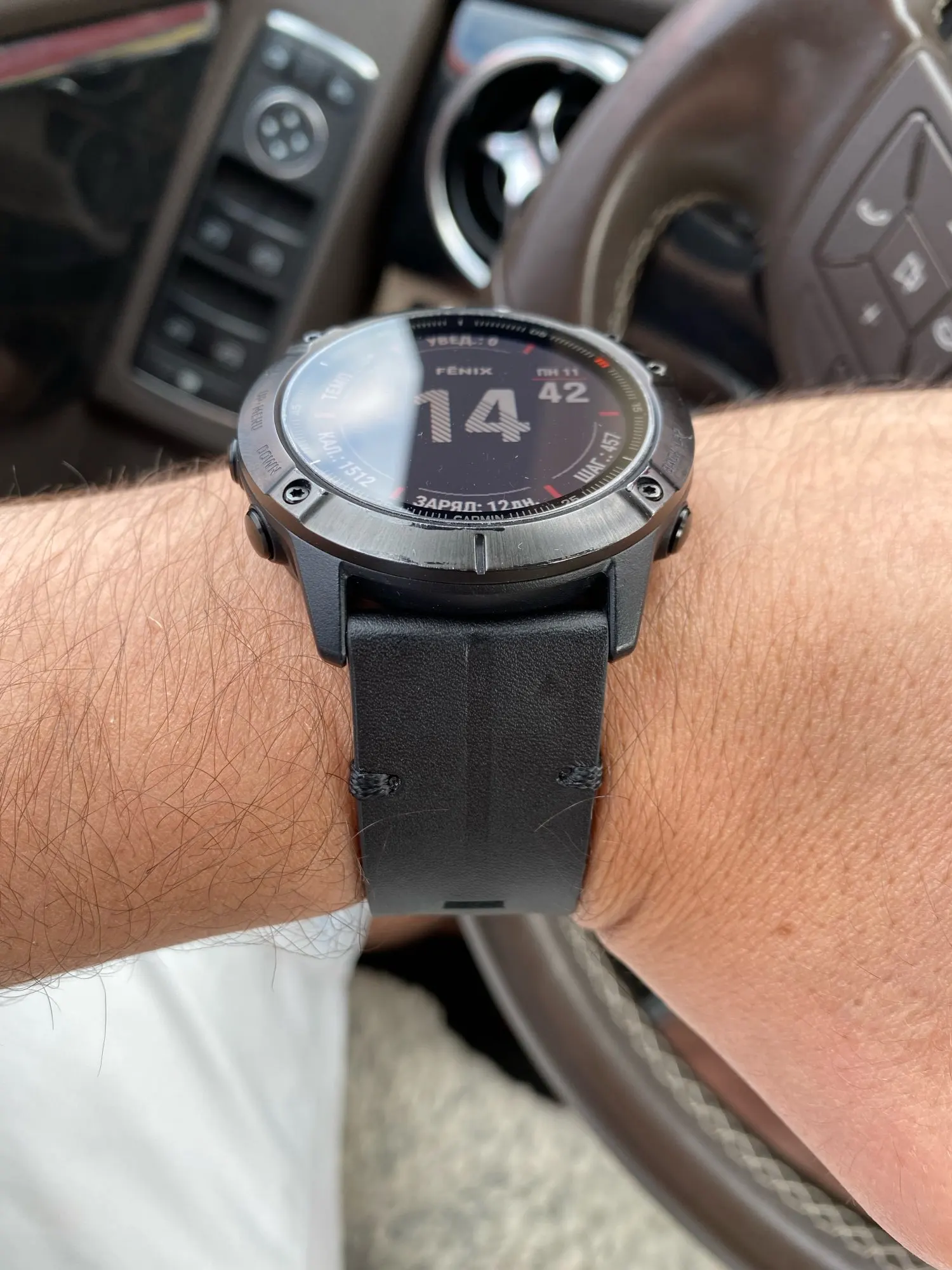 Ремешок, судя по запаху, кожаный. Выглядит хорошо, но гарминовские треугольнички сделаны плохо. Замки QuickFit почти не люфтят. Но я не могу его заправить в первый тренчик - ремешок не гнётся! Этот момент - на последнем фото.
