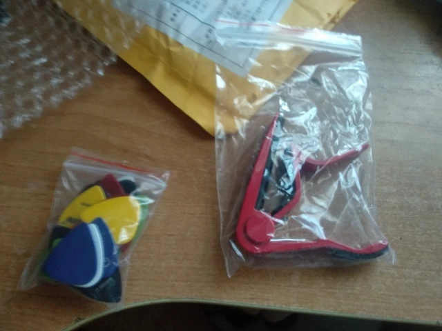 заказ пришел быстро, в комплекте медиаторы разной толщины и цвета. ничего не потерялось и я рад:) магазин надежный, буду заказывать еще:)