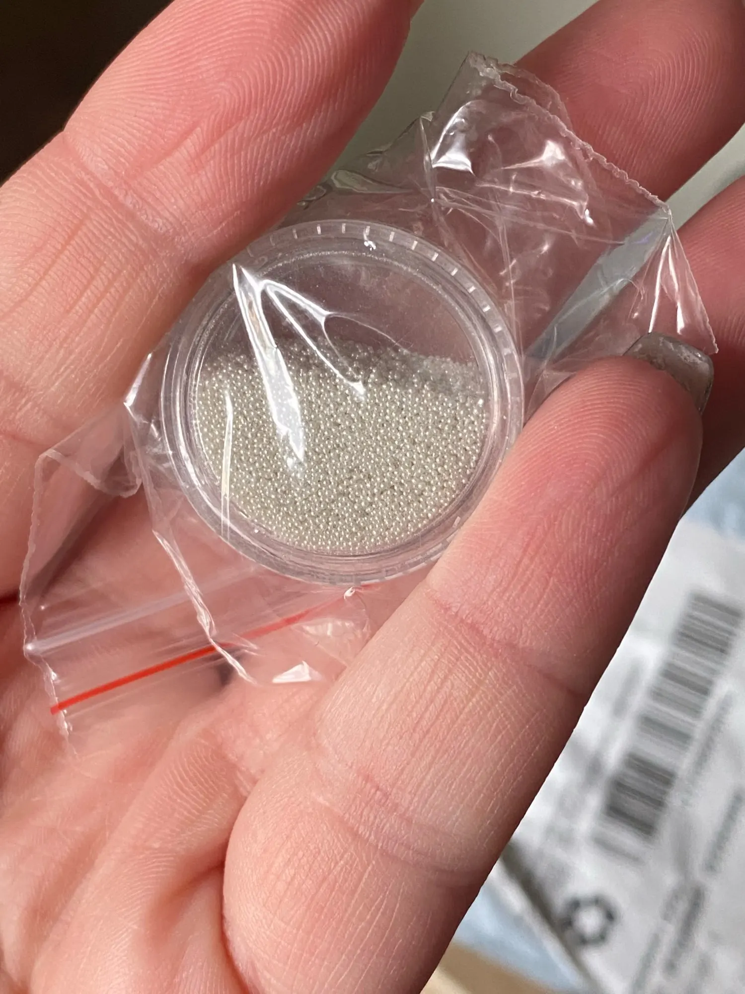 Белый, очень мелкий, полная баночка - все как ожидала. Спасибо!