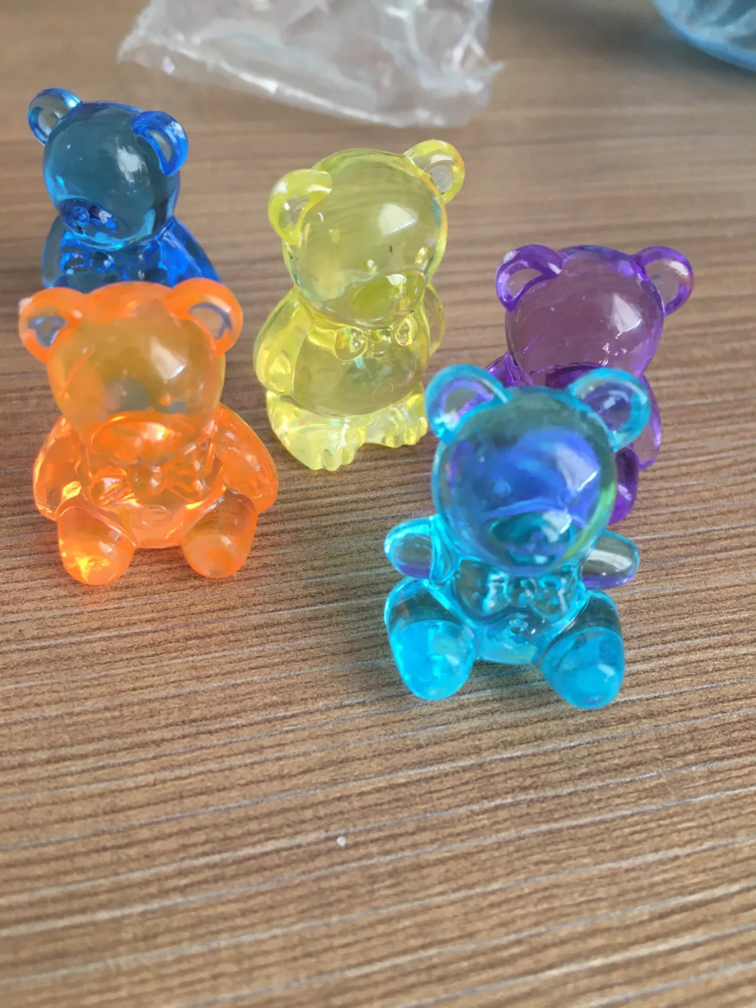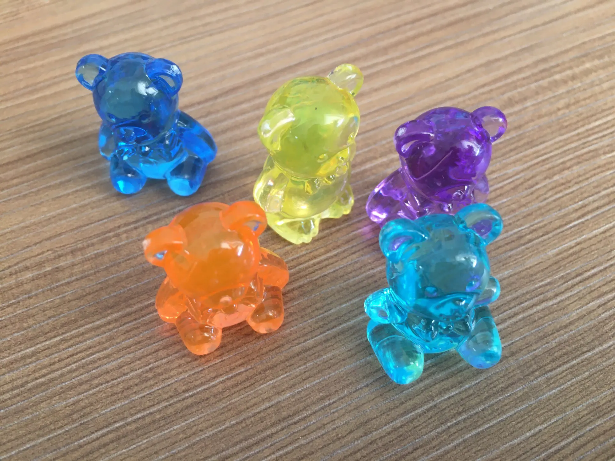 Доставка в Украину заняла около месяца, может чуть больше. Ребенку понравились медведи. Цвета немного отличаются (тусклее чем на картинке). Покупались как фишки для настольной игры.
