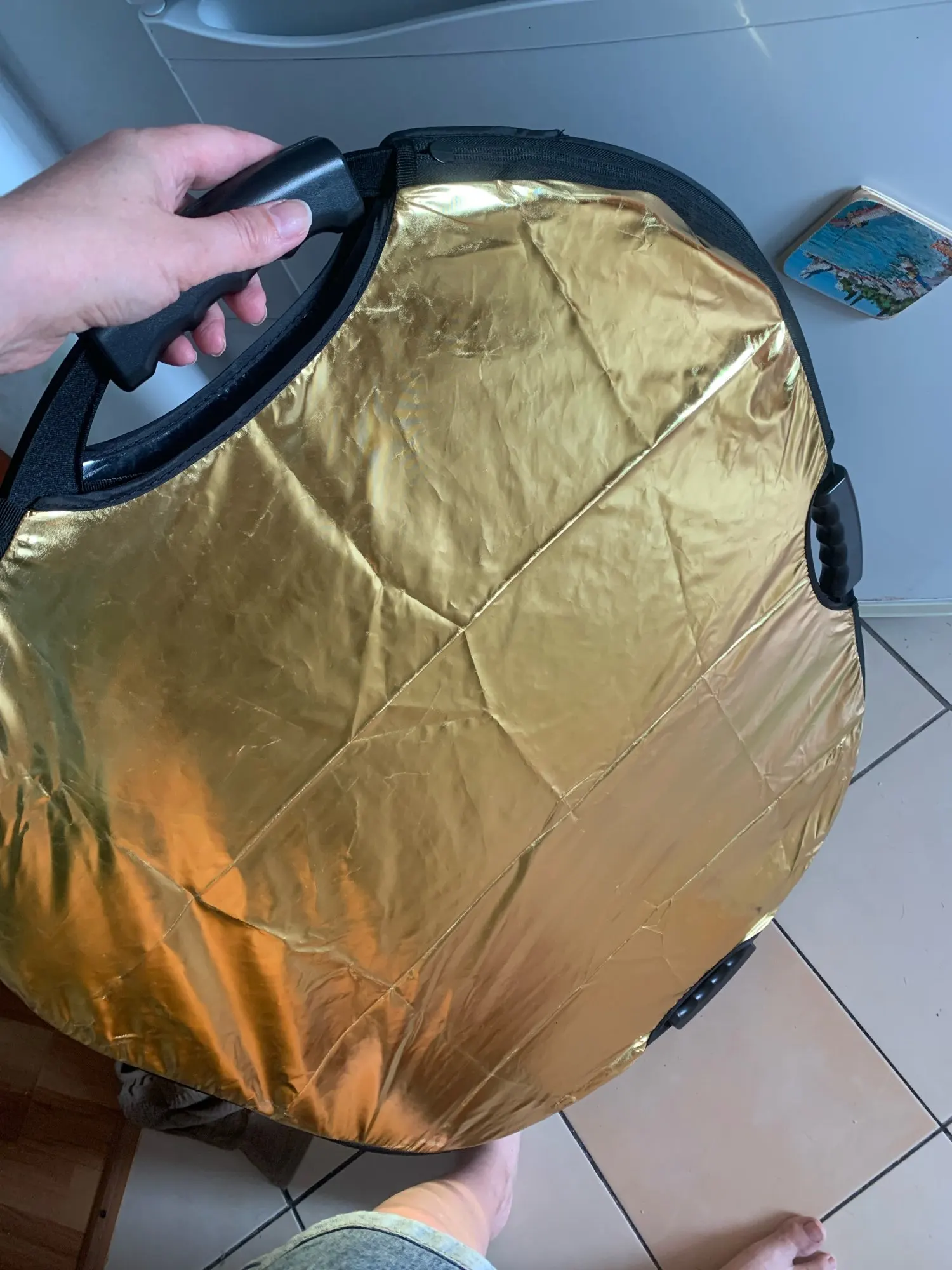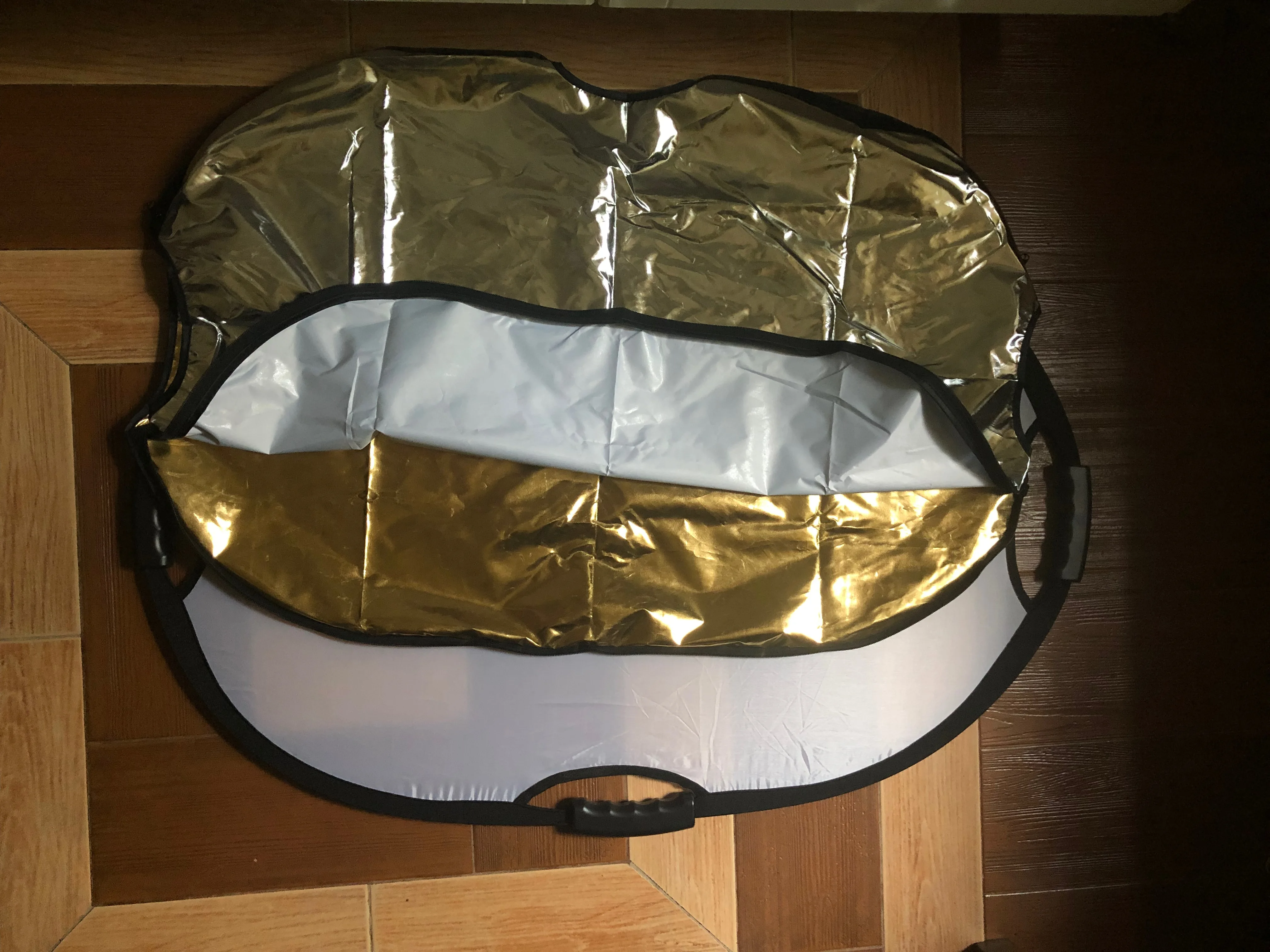 Отражатель пришёл быстро, но был использованный.Фон на просвет был весь в пятнах, а золотой осыпаный и потресканый