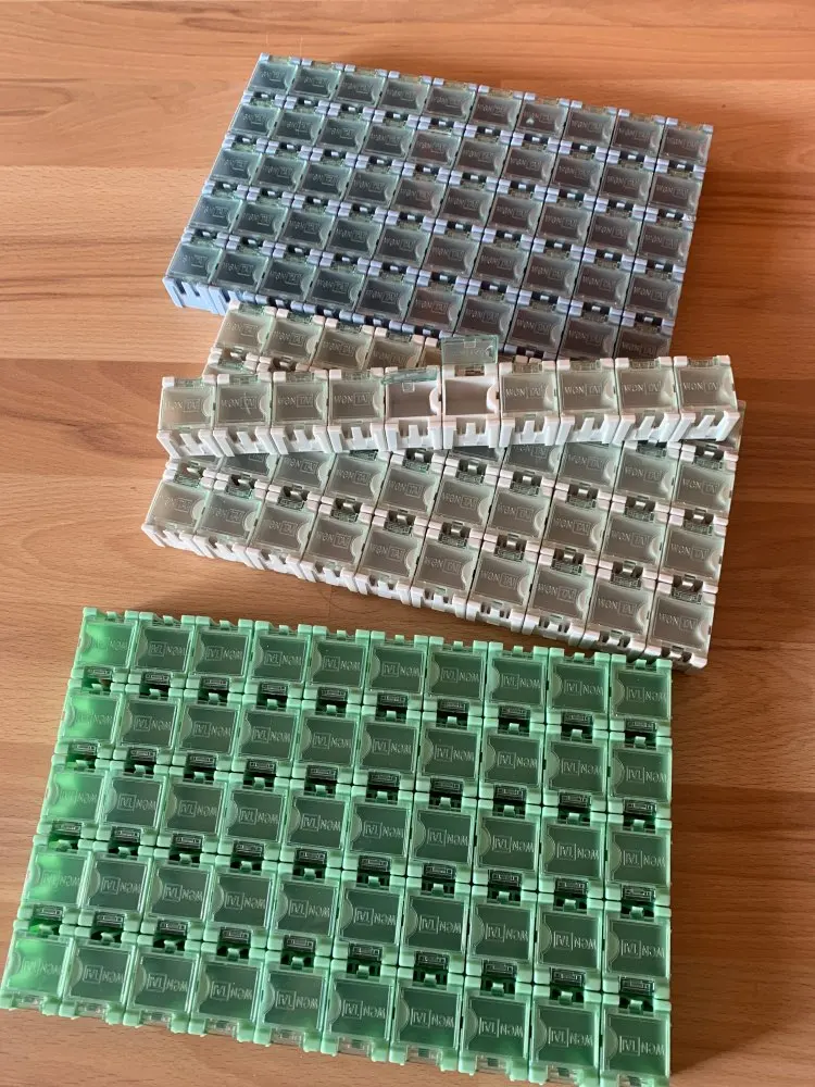 Качество весьма среднее. Часть крышек заедает и нормально не открывается. Из за облоя защелки не защелкиваются и конструкция рассыпается в руках. Требует доработок. Заказывал три комплекта - пришли разных цветов.