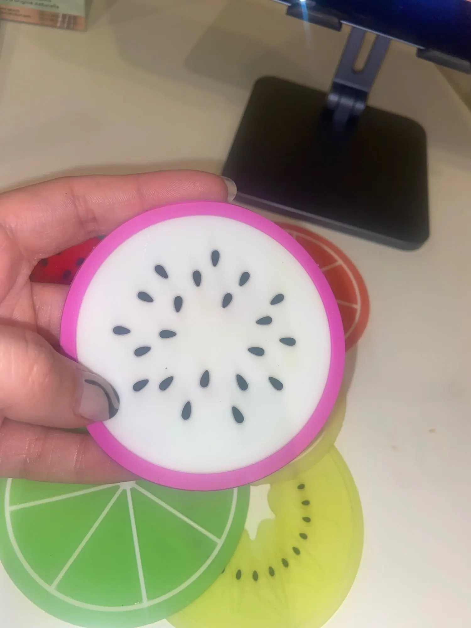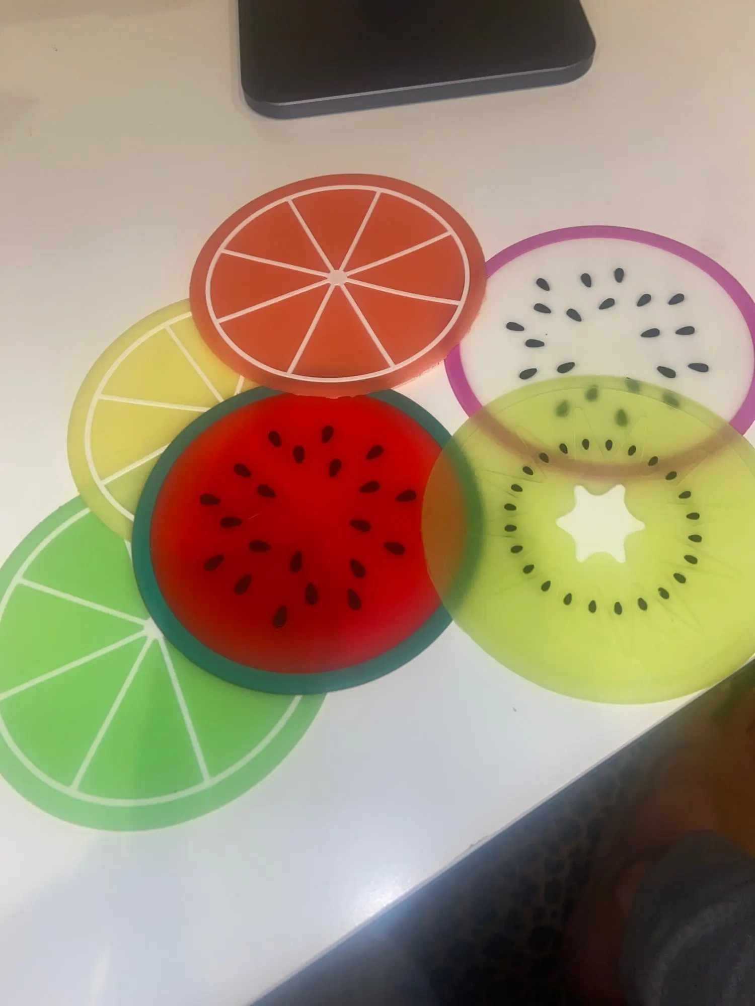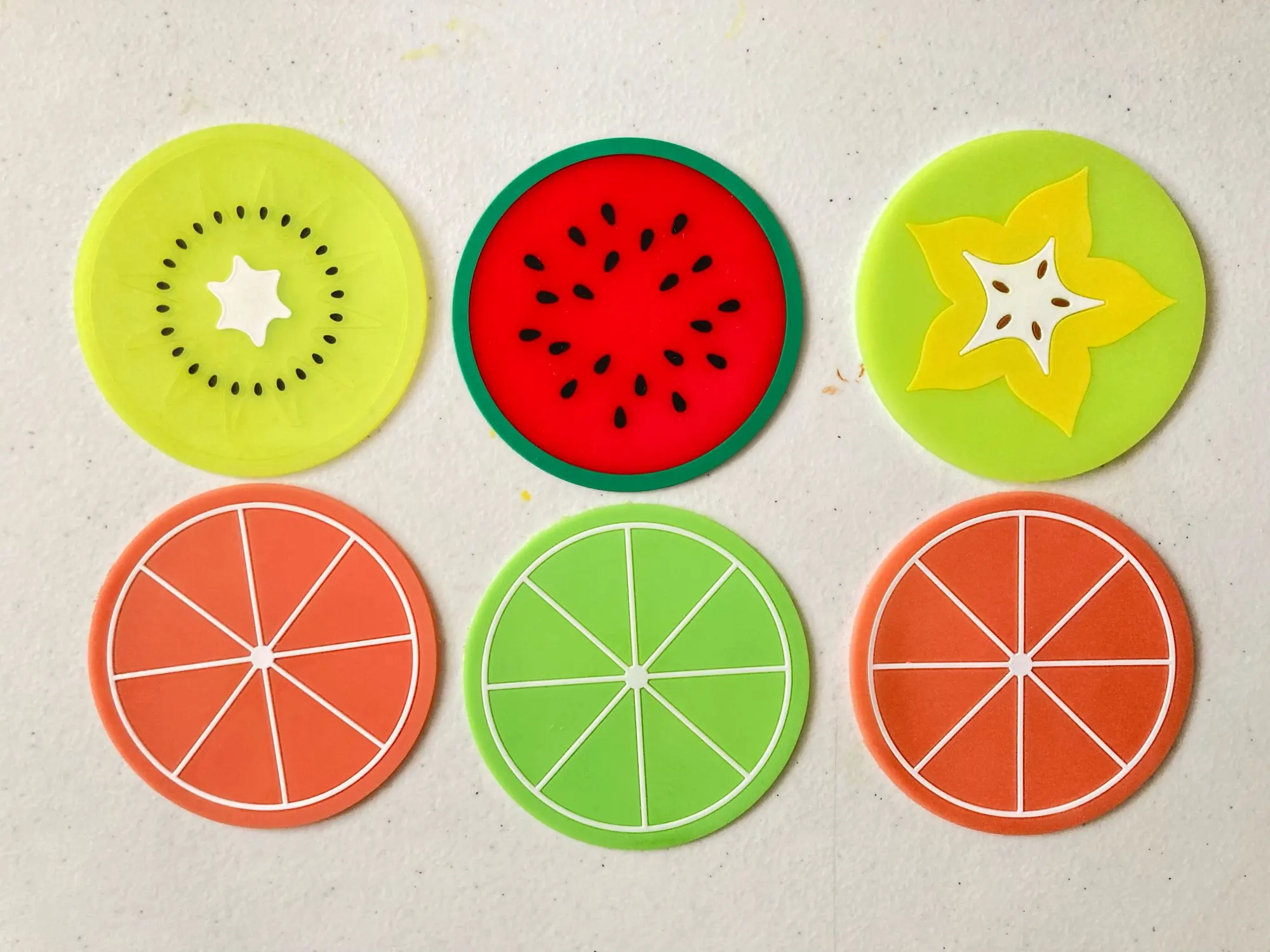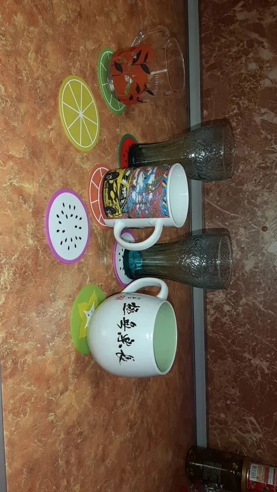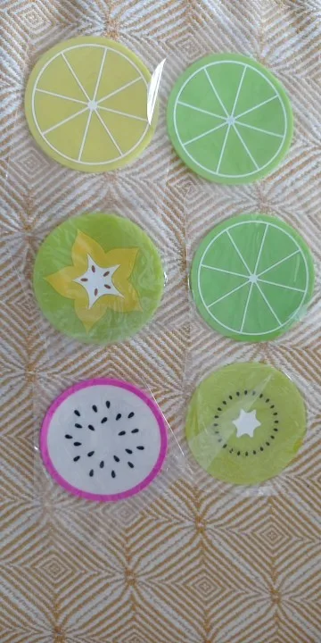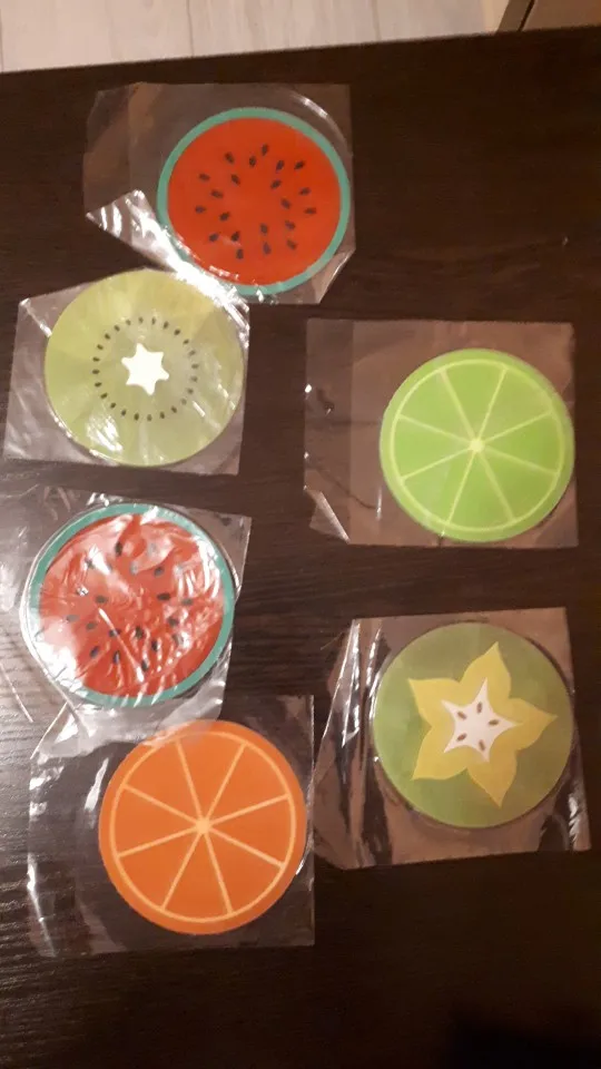Подставки понравились. Качество хорошее. Единственный момент, что цитрусовые подставки чуть тоньше и подставка с цветочком не плоская, а топорщится вверх. Но в общем и целом товар неплох. С продавцом не общалась.