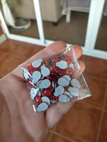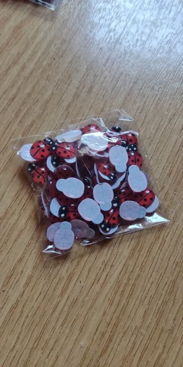 выглядят шикарно,не большие,чуть больше настоящей Божей Коровки,блестит и клеится хорошо,в Латвию пришли за месяц