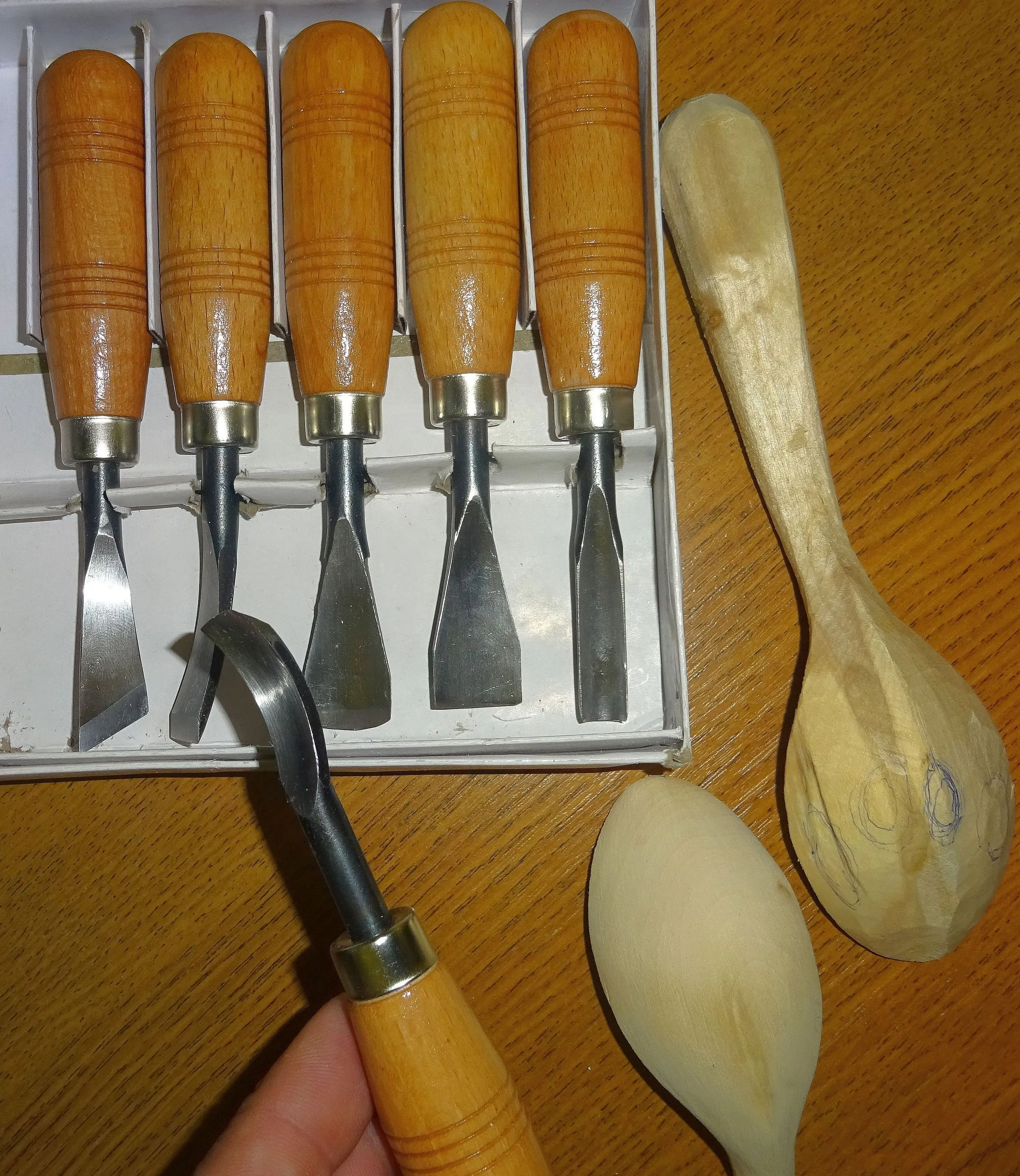 Получил набор N6 c шестью силовыми стамесками для ручного реза всякой утвари. У меня уже есть набор N5 с шестью грибками - штихелями. С набором N 5 я уже начал вырезать правильные ложки как из липы, так и из берёзы с одинаковой формой. В наборе N 6 также есть клюкарза. Единственное набор придётся весь перетачивать и выводить. Но это обычное дело. Всякий инструмент работник готовит сам под себя и свои запросы. А так очень бюджетно. В работе посмотрим. Набор N5 я уже весь испытал. Теперь буду заниматься этим новым набором с широченными стамесками. Вся доставка в Ульяновск заняла 12 дней. Большое спасибо продавцу за правильный инструмент.