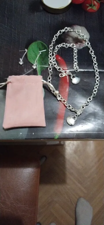 Красивый комплект, Сомнения по поводу серебра, на цепочках не нашла пробу, хотя продавец уверяет что есть, проба есть на сердечках, и это странно, поставить пробу в центре подвески, сначала подумала что дефект покрытия, царапина или вмятина, а это проба) Но выглядит очень красиво. У нас бижутерия этой актуальной формы дороже