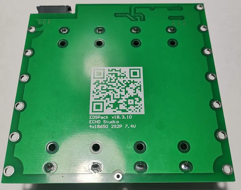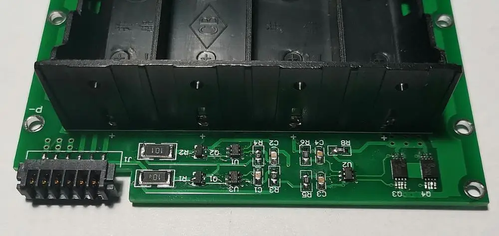 С ёмкостью я немного ошибся. Оказывается, элементы соединяются параллельно по два, ёмкость сборки увеличивается в два раза. У меня получилось 6600мА/Ч (6600mA/H). Следует учесть, что производится балансировка двух элементов одновременно. И, самое главное, все элементы нужно устанавливать клеммой "+" в сторону разъема!! (на плате есть соответствующая маркировка) Кому интересно, на фото печатная плата с демонтированным держателем элементов.