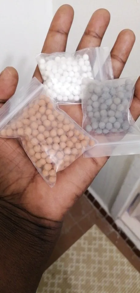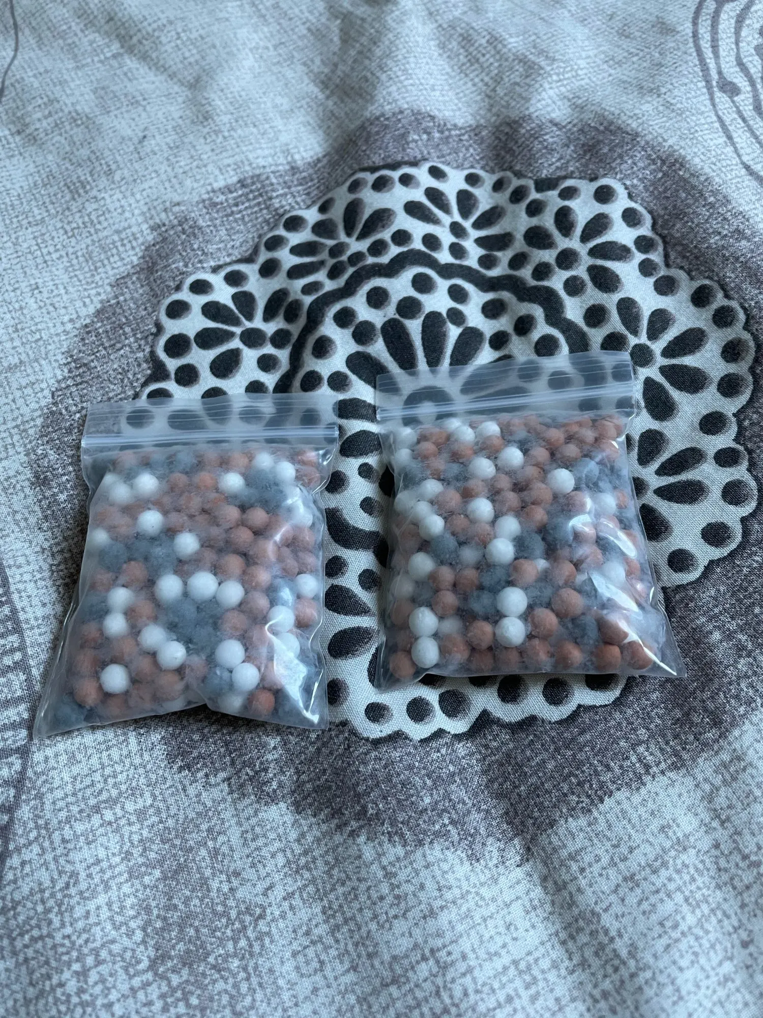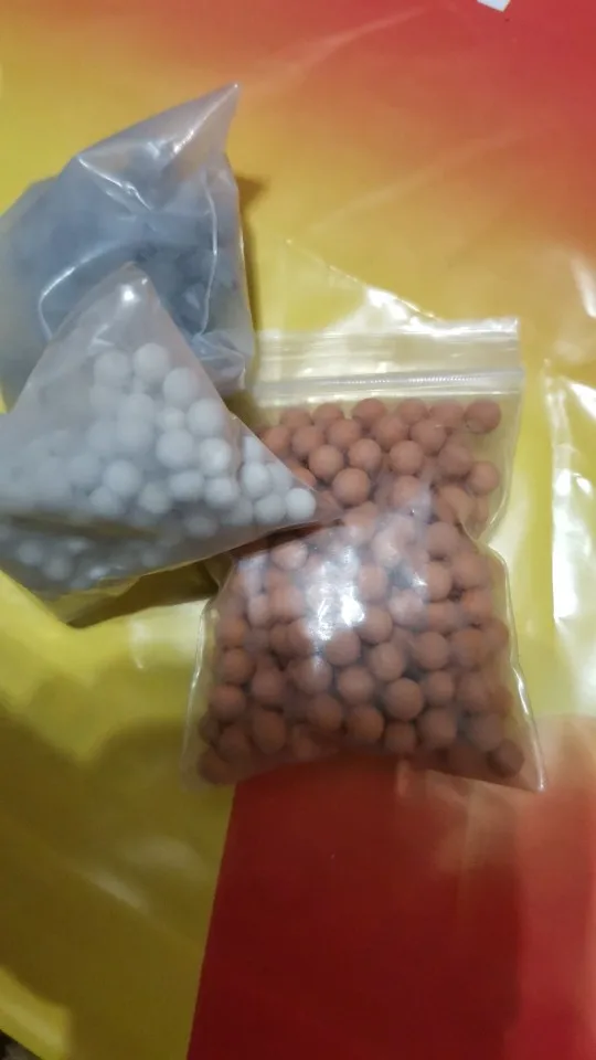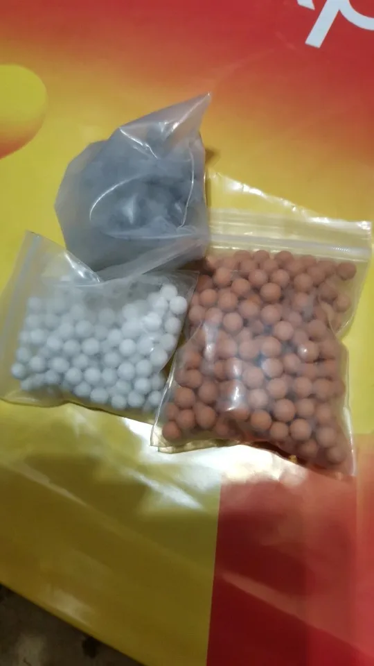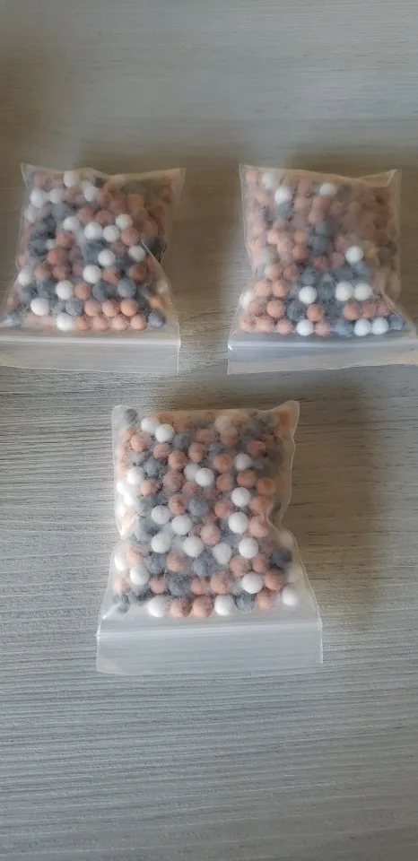 заказала два полных комплекта (три вида шариков в отдельных упаковках) и один пакет со смесью шариков. сразу скажу - ни в одном пакете нет 55г. белые и серые шарики - по 20г в пакете, а рыжие и смесь - по 50г в пакете.