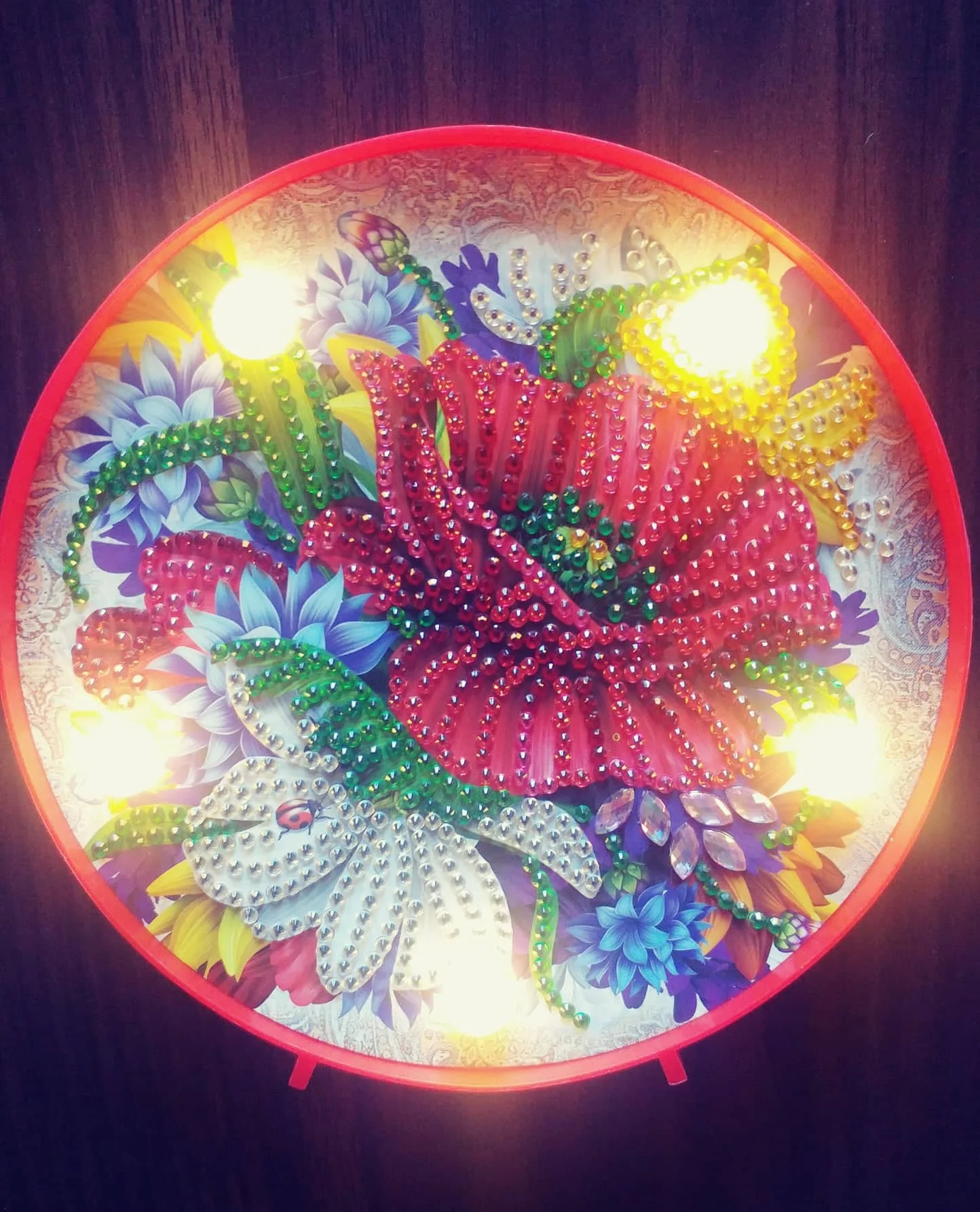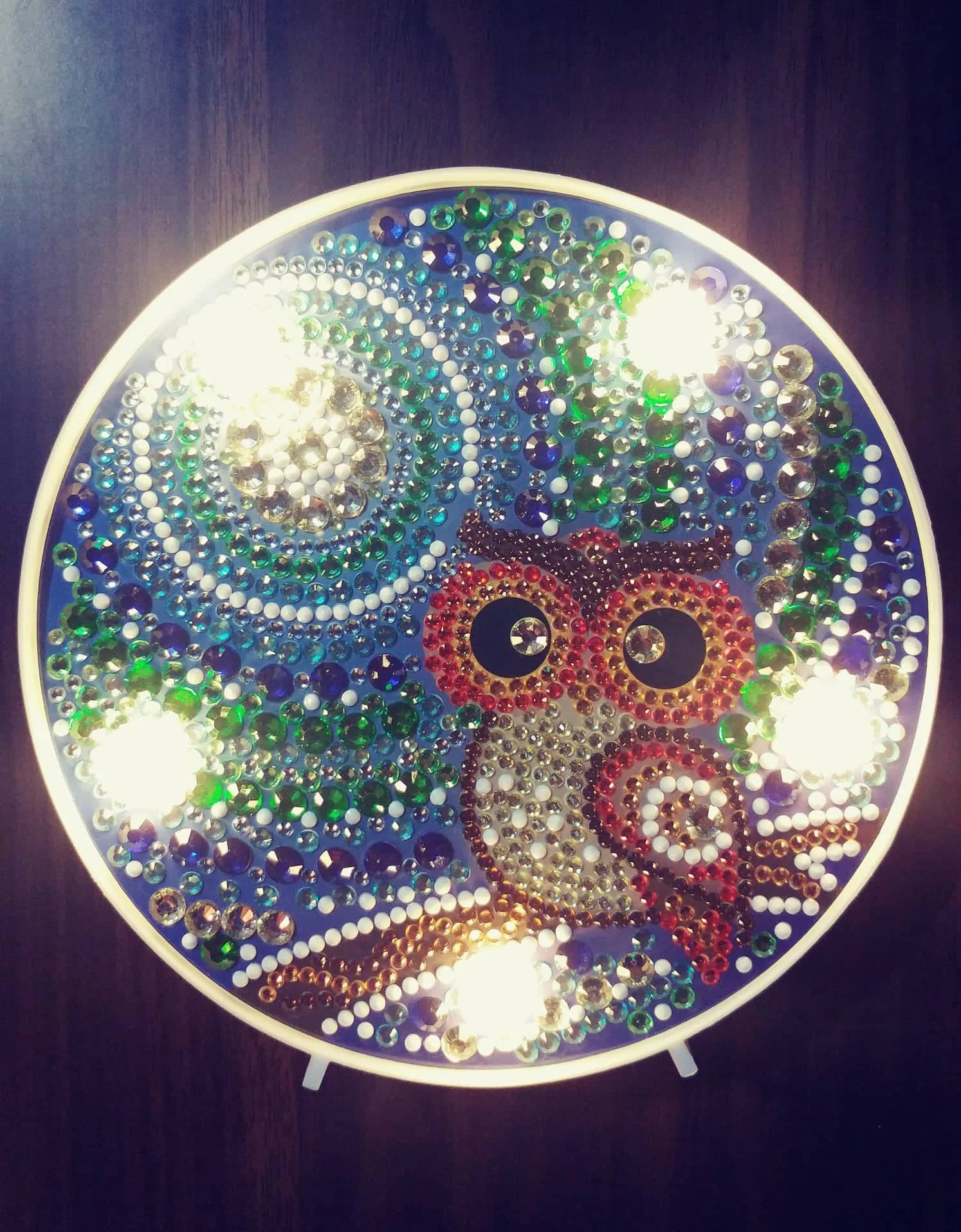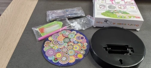 Товар упакован в коробку. Собрала алмазики за два часа. Ночник работает от двух пальчиковых батареек. Батарейки в комплект не входят. Общее впечатление: игрушка для детей, дорого... Не производит впечатления за эту стоимость. Доставка больше месяца. Пришли четыре разные посылки в одном мешке.