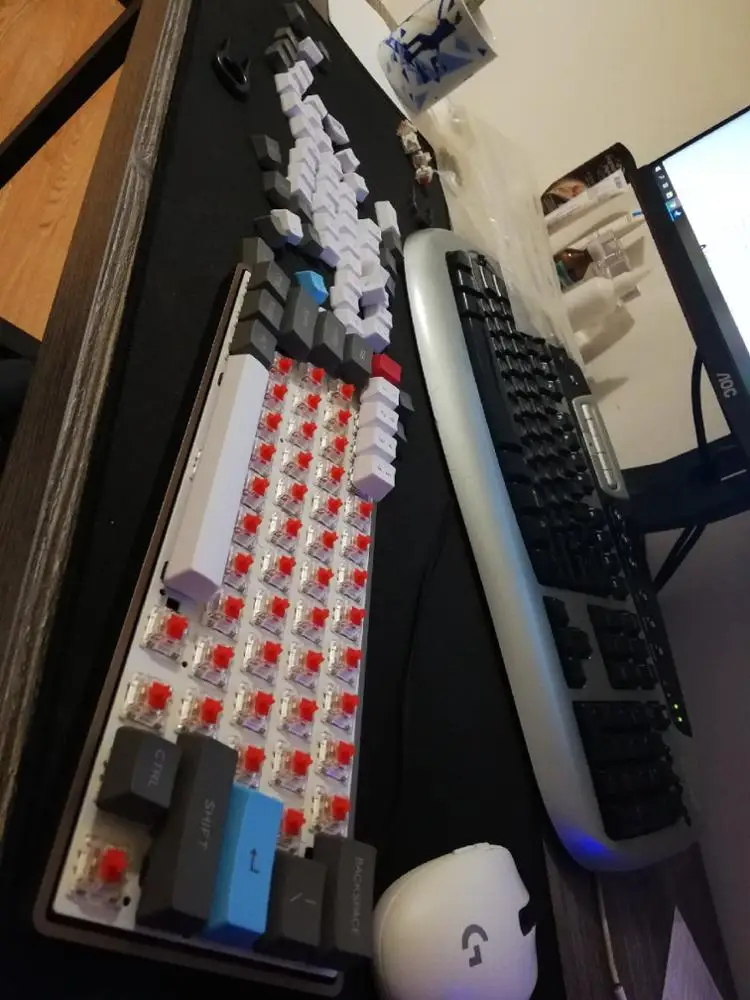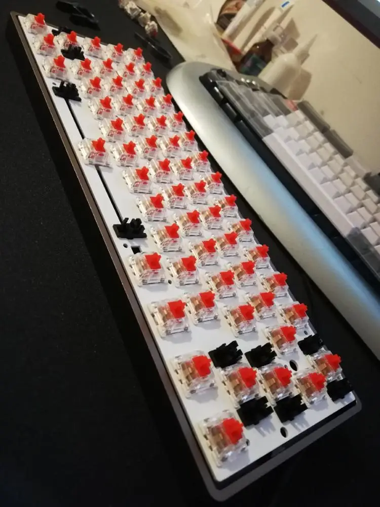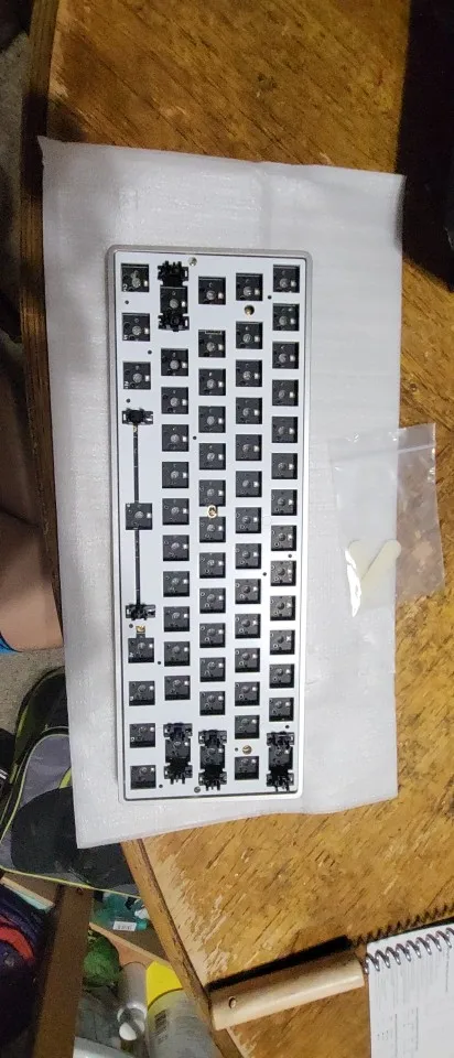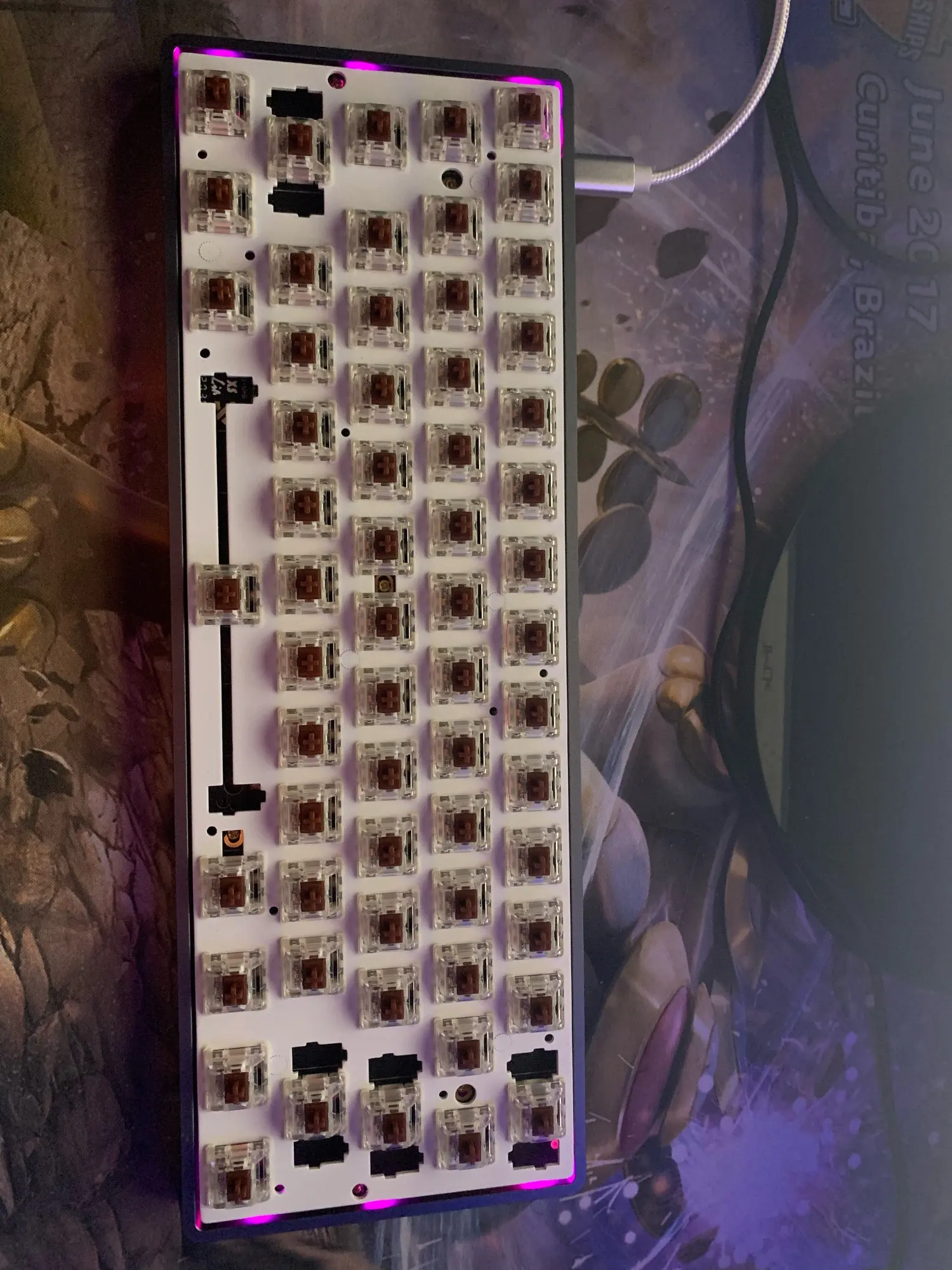 Все пришло в сборе, то есть мне осталось только установить стабилизаторы, свичи и кейкапы. Заказывал кейс, плату (Bluetooth версия), пластину. Коричневый цвет выглядит отлично. Кстати в комплекте интересный джинсовый кабель.