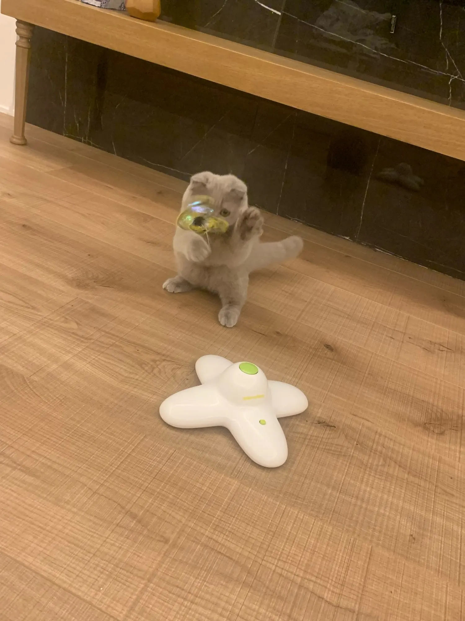 У кошачьей радости есть свои слабые стороны - меньше недели потребовалось усатому чтобы оторвать бабочку от проволоки. Конечно есть запасная, но это явно расходники. И тут не могу сказать что цена на эти расходники сильно порадовала.