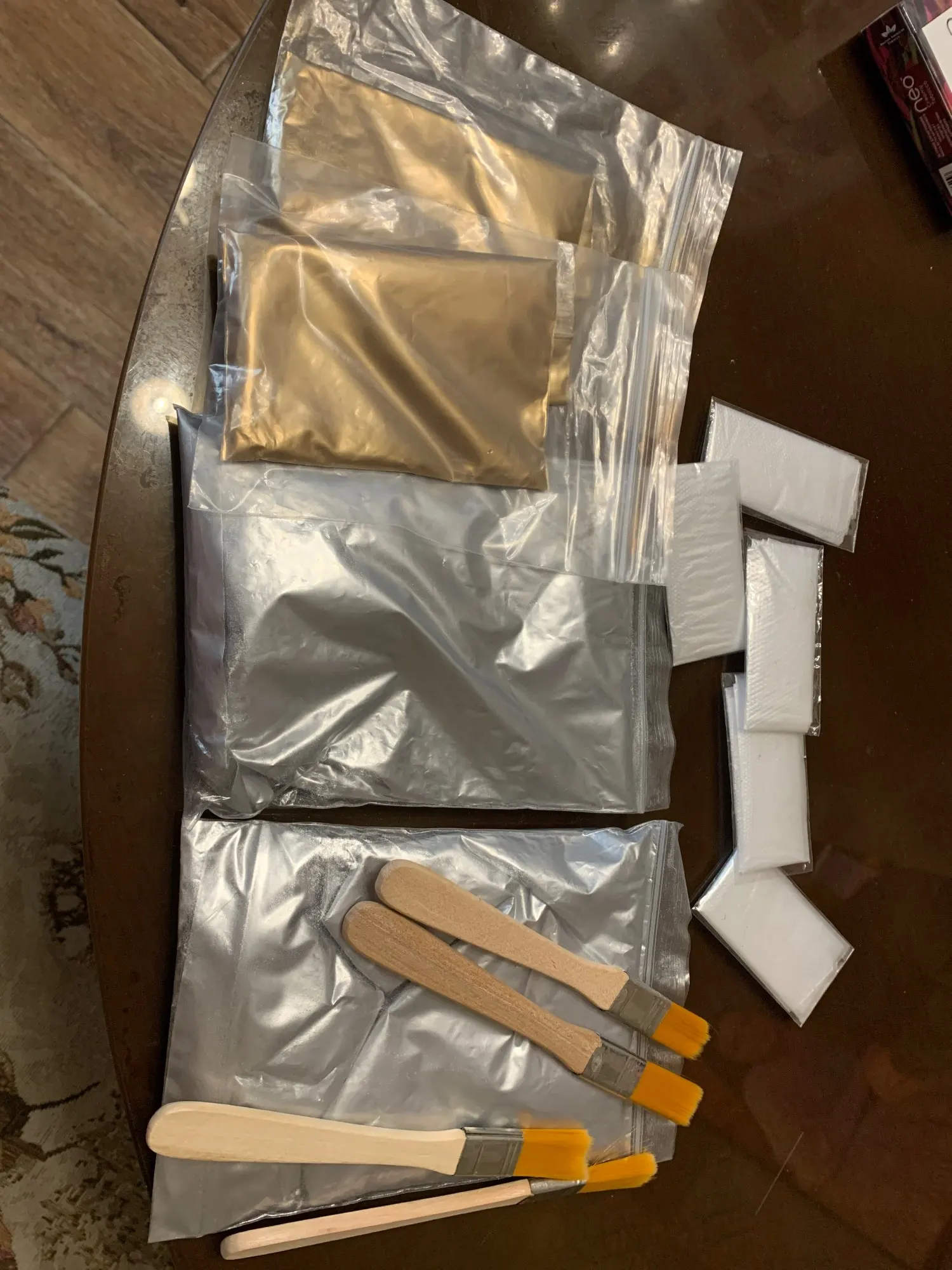 доставка долгая-2 месяца. положили кисточку синтетику плоскую 1см и перчатки. неожиданно и приятно. Заказала в двух разных магазинах-вдруг один приедет быстрее. приехали оба заказа в одном пакете.