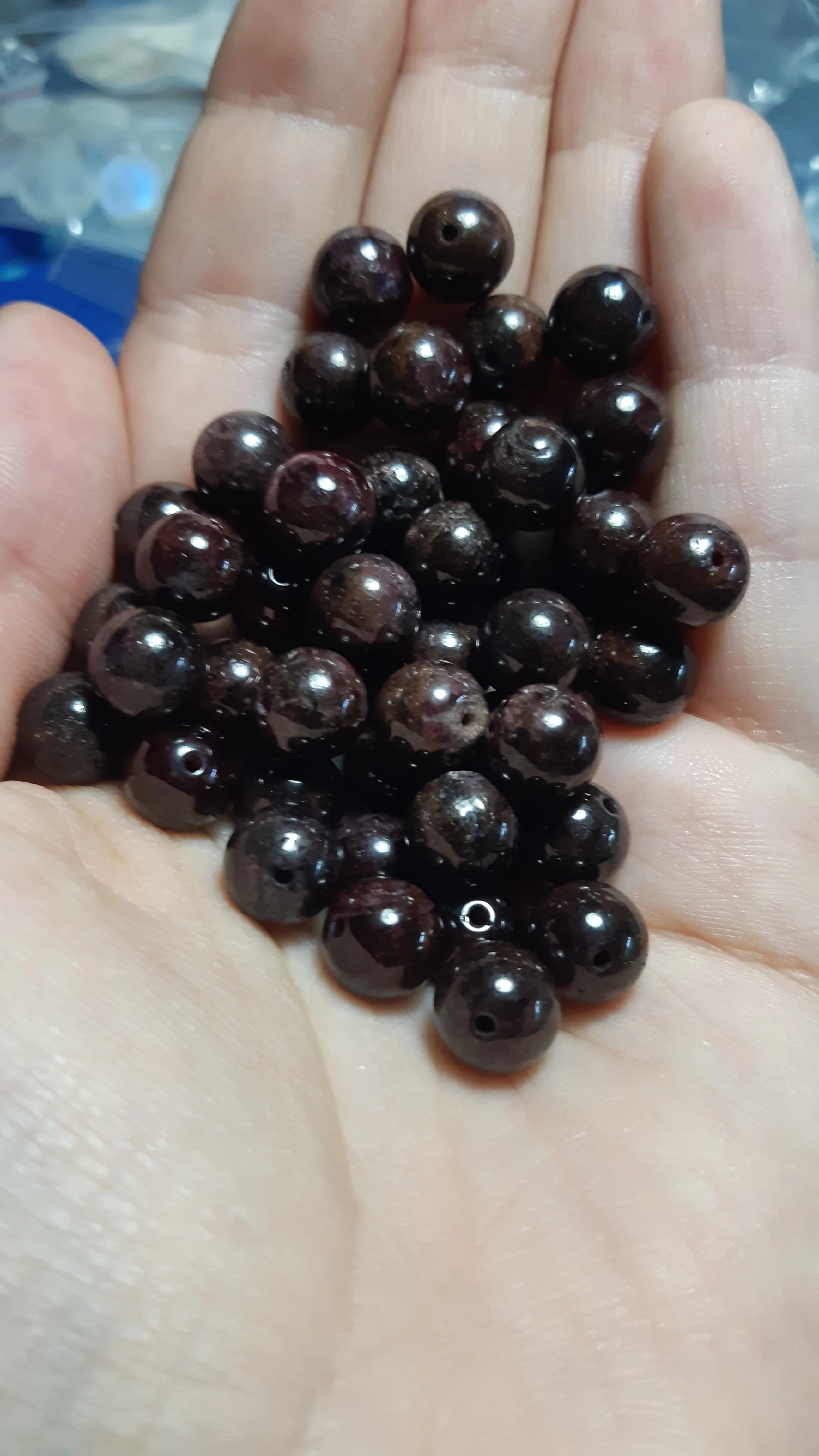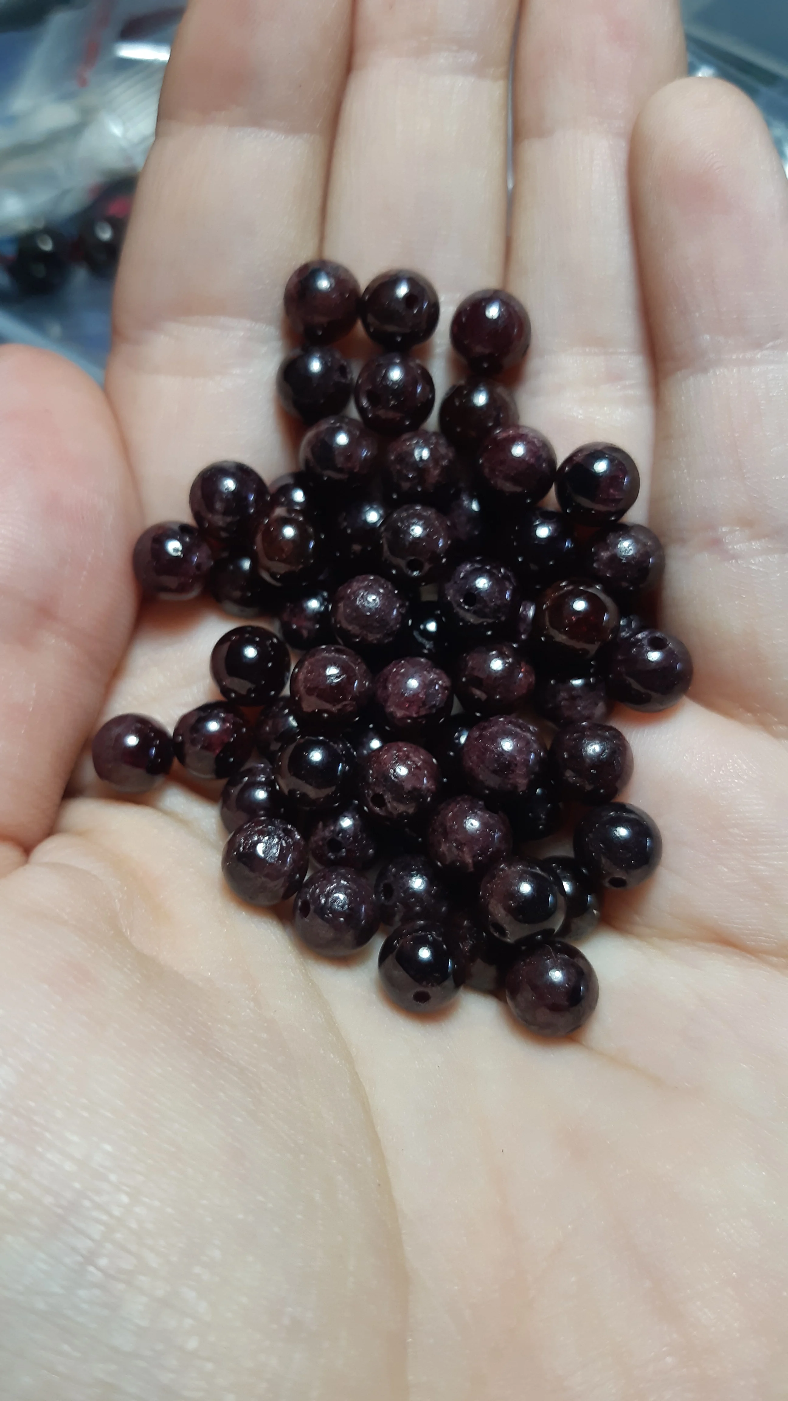 очень красивые,ровные блестящие,тяжёлые и холодные.думаю натуральный камень.не прозрачные,цвет скорее бурый не красный.не магнитятся.дошли за две недели.одна нить в притык под горло,в натяжкой.для нормальных бус лучше брать две нити или добавить фурнитуру.