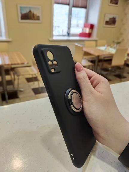 уже прикрепила кольцо к чехлу, так что чехол как на картинке. матовый, скользящий немного (потому и прикрепила кольцо). прекрасно подошёл к телефону, легко снимается и надевается, всё нравится)))