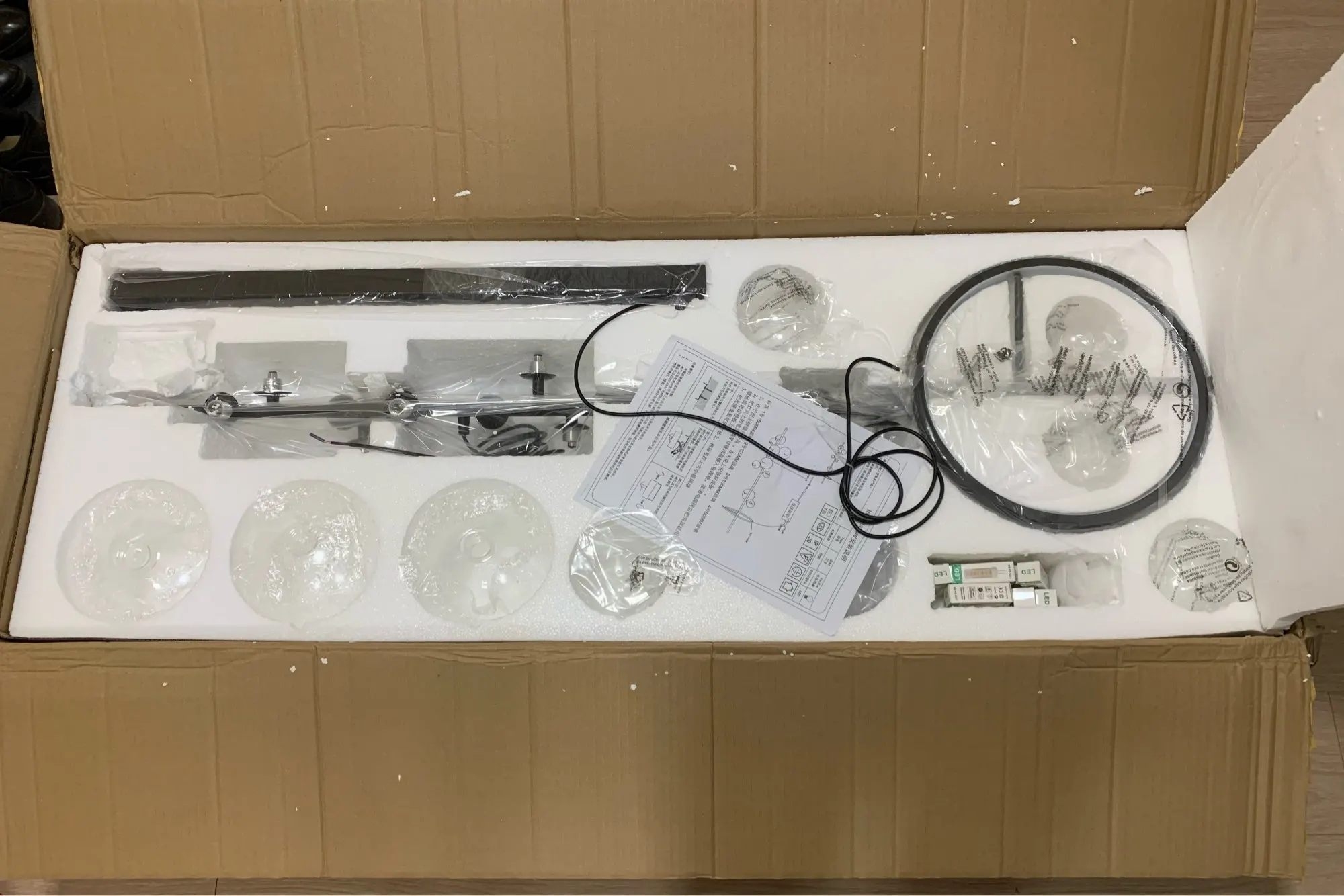 22 июля сделали заказ, 20 августа привез курьер IML на нужный мне адрес. Это моя самая большая по габаритам посылка с Али ))) Коробка большая, с виду вроде целое. Люстру пока не повесили. После монтажа потолка обязательно обновлю отзыв и прикреплю фотографии.