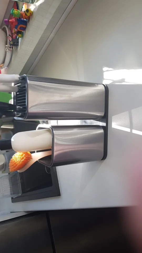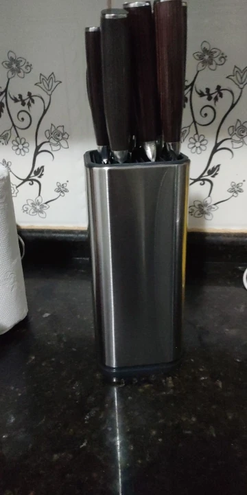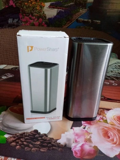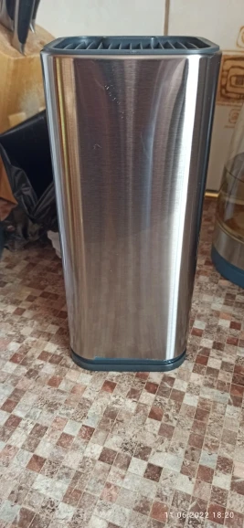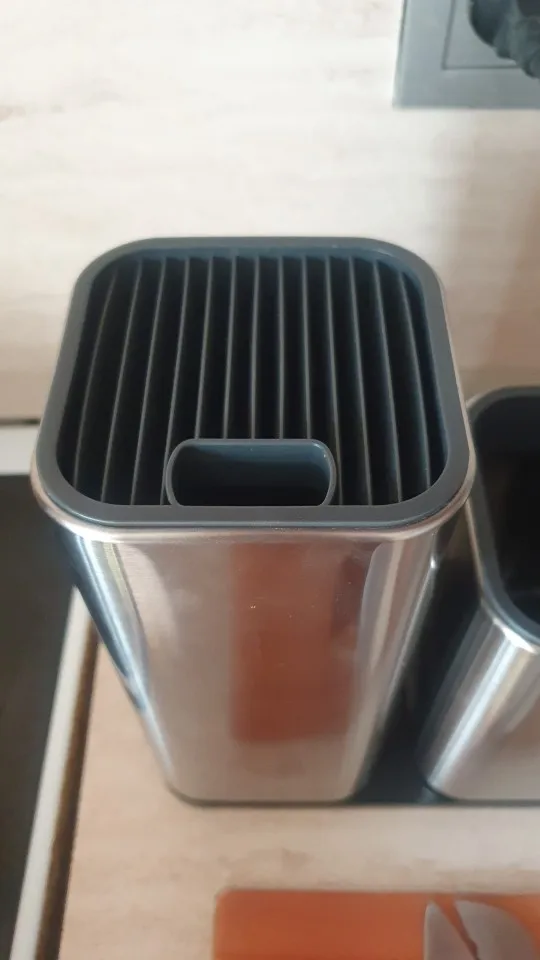 Выглядит отлично, сделано добротно. Нижняя крышка на защелках и с усилием снимается. Верхняя сидит крепко. Ребра решетки в верхней крышке не особо и глубокие - около 1 см, так что если ножи длинные - будут соприкасаться лезвиями около дна. И если ручки у ножей массивные - устойчивость всего держателя снижается.