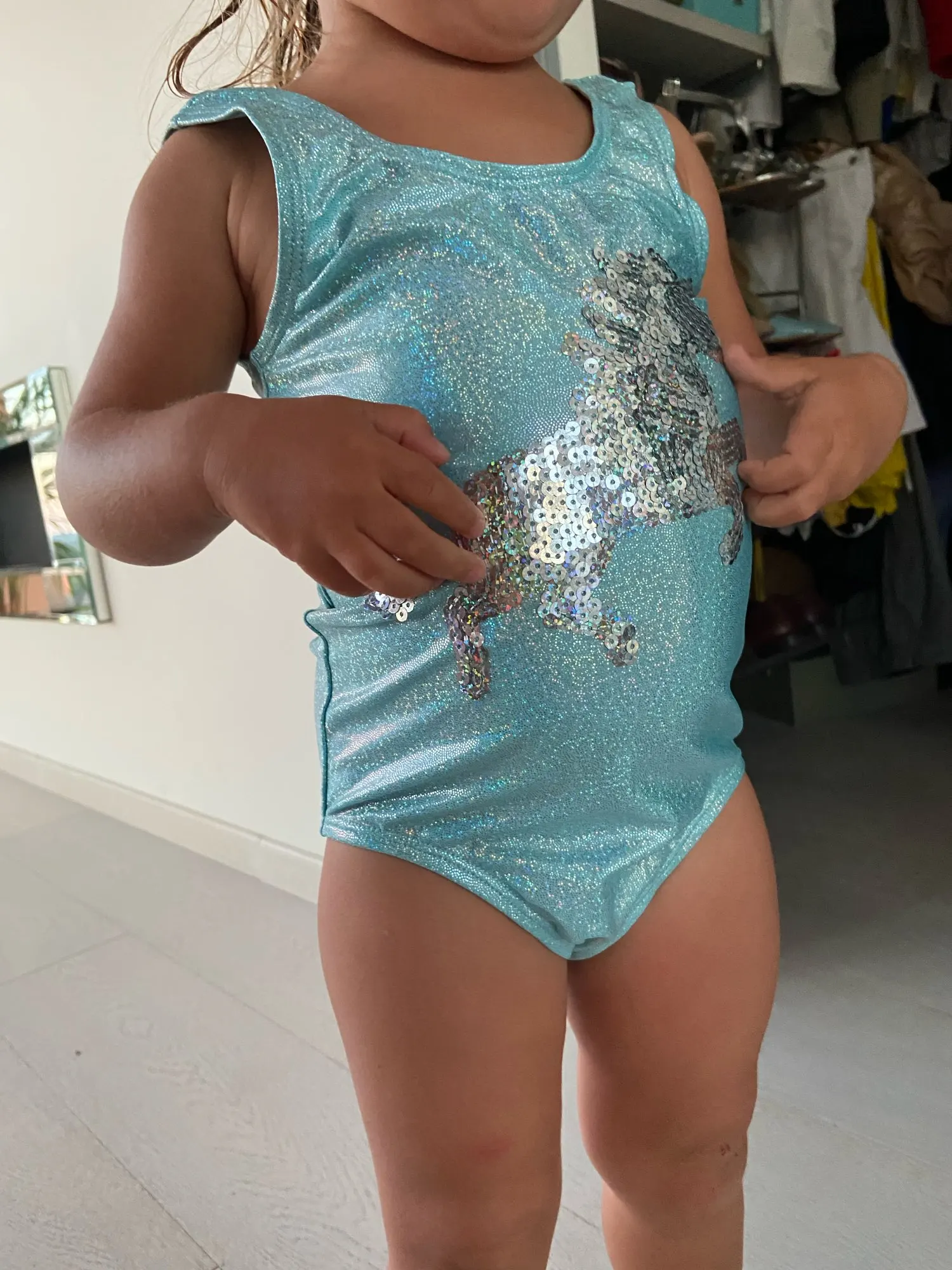 Качество очень хорошее, но нам, к сожалению, мал. Хотя взяла 7-8, на 6 с половиной лет, телосложение нормальное, не худая, не толстая. Видимо, маломерит немного. Звездочки зеленоватые на чёрном купальнике (думала будут белые).