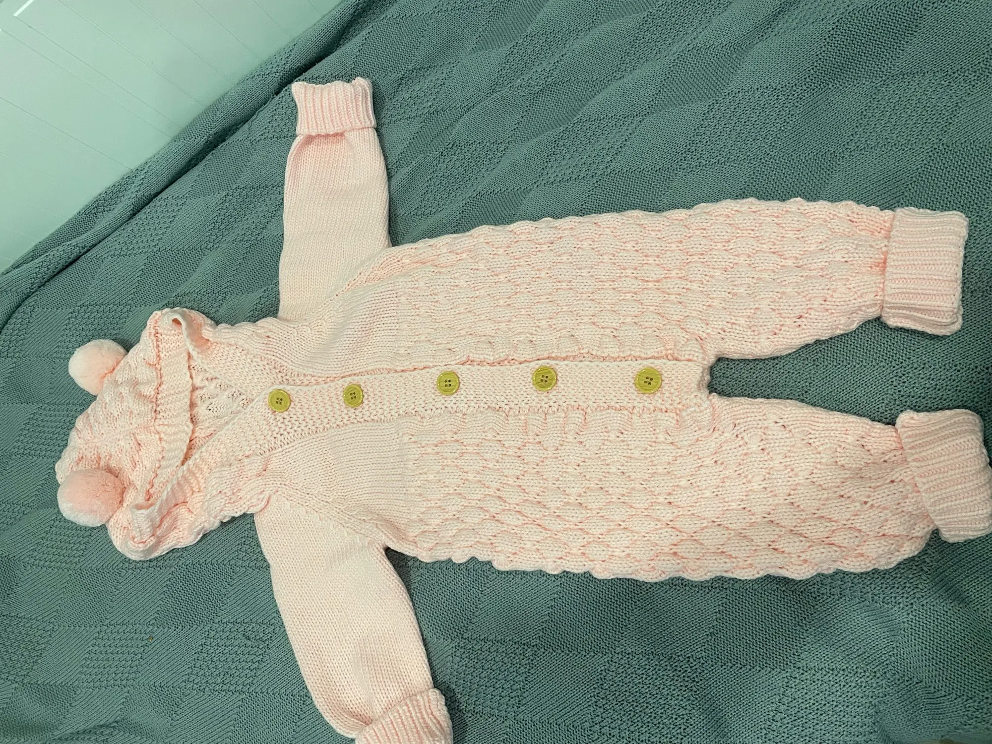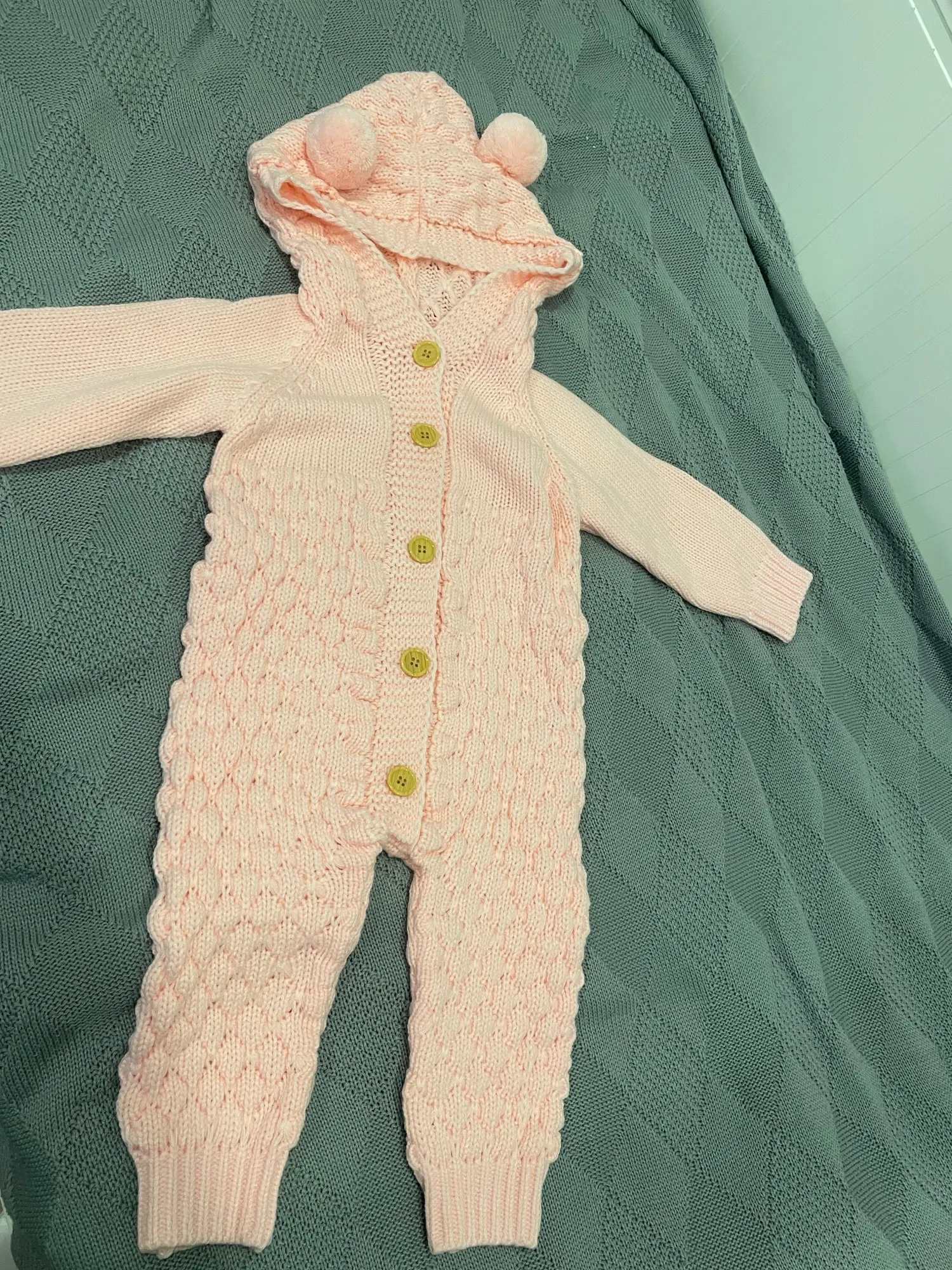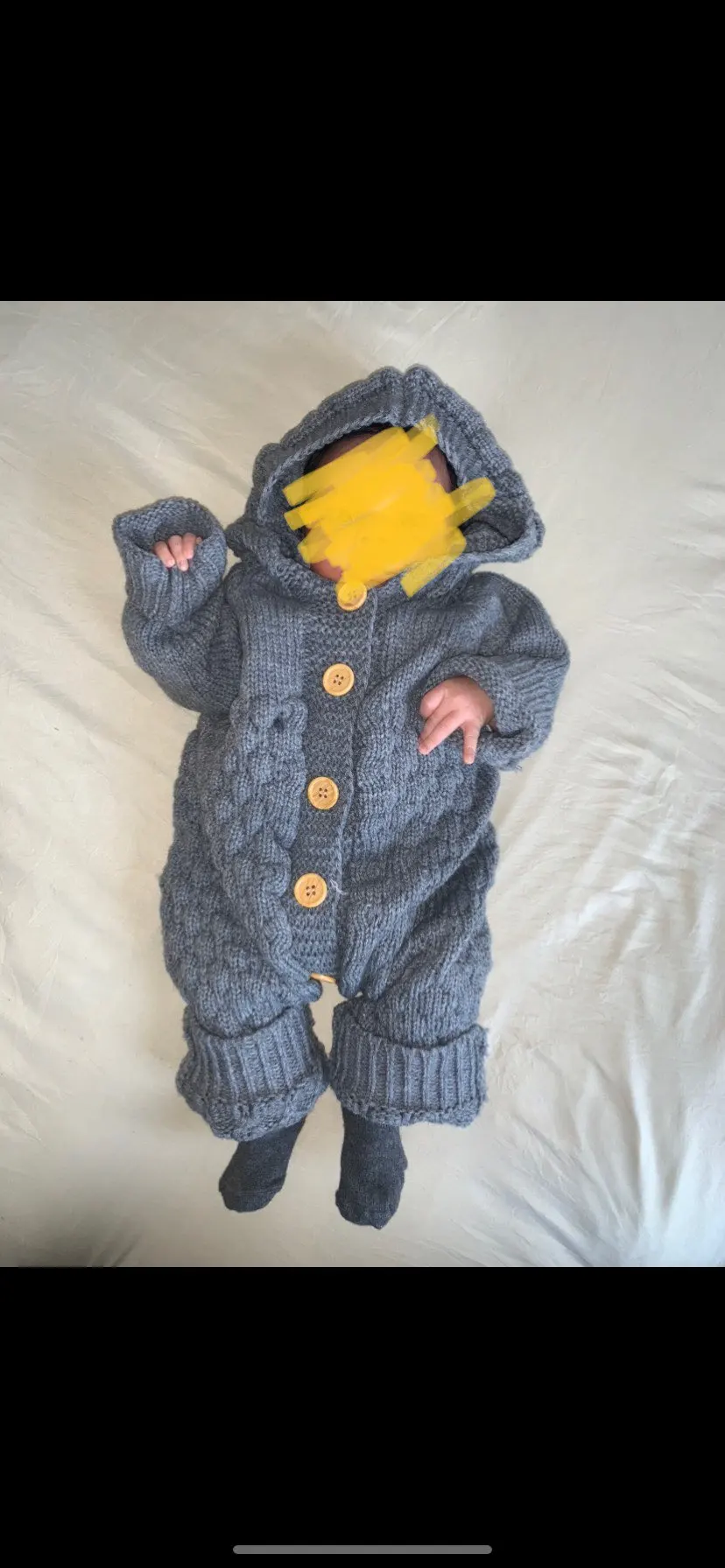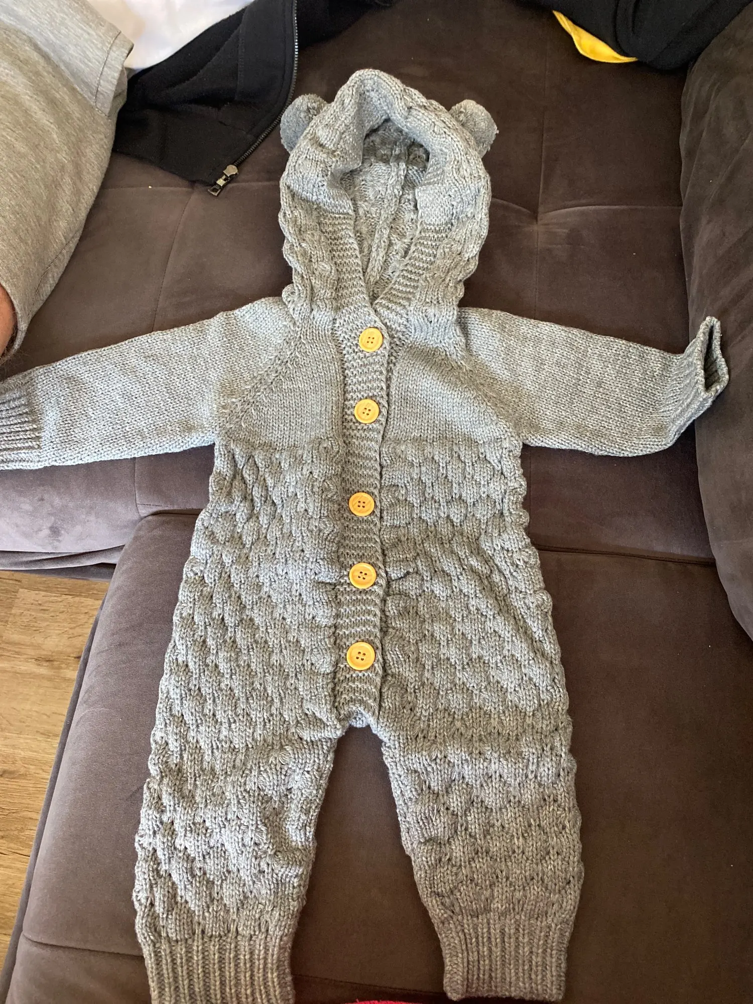 Милый костюм, но синтетика , не хлопок , полностью акрил . Для младенца размер М -большой, не подходит , это для ребёнка на 4 месяца. Само качество не плохое, не очень тёплый костюм , больше для весны